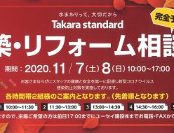 新築・リフォーム相談会を開催します! 【完全予約制】日時:2020年11月7日(土)8日(日) 10:00 ~ 17:00場所:タカラスタンダード 福山ショールーム 【完全予約制】 各時間帯2組様のご案内となります。