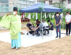 こんにちは!営業課の開地です。7月15日 大安 13:30~少し風があり、雨ももってくれて、無事に地鎮祭を行えました。 お施主様と弊社スタッフで、土地の神様に工事の安全と施主様ご家族の幸せを参らせていただきました。