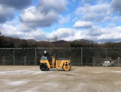 こんにちは。環境事業部渡邉です。 今月半ば辺りから新市中央中学校のテニスコートの整備を進めています。 高さを決めて重機での整地。 消石灰や塩化カルシウムの散布。 ロードローラーでの転圧。 ネットポストや審判台の塗りなおし。