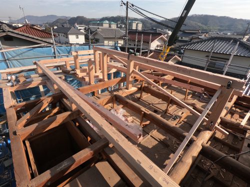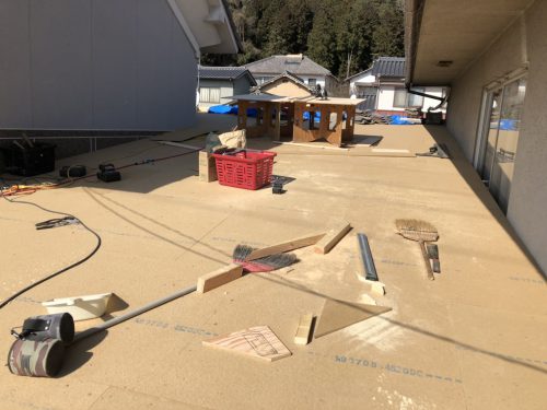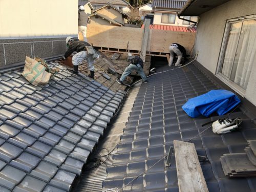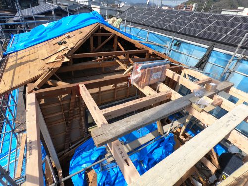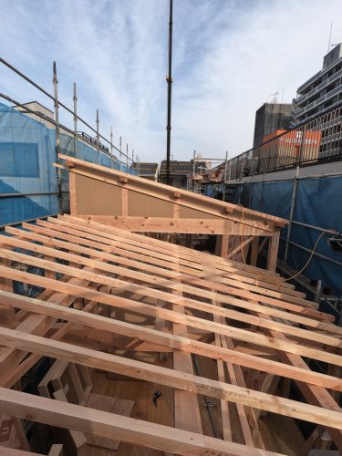 瓦を撤去して垂木を流して合板とコンビボードの2重張りです