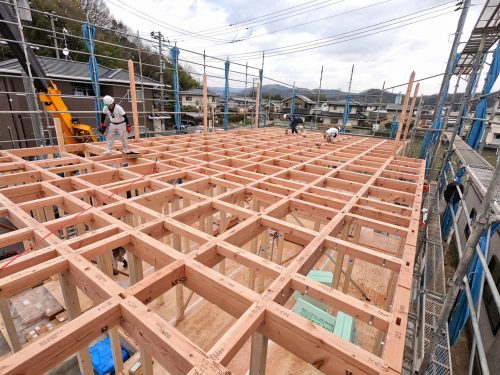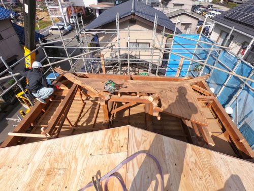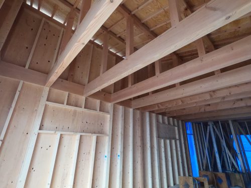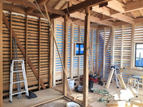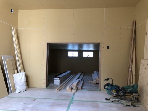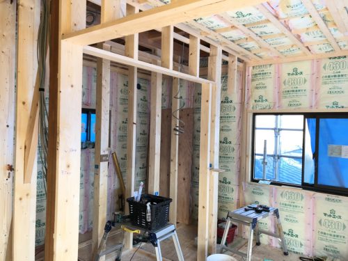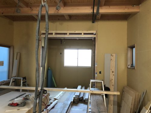 外はモルタル塗りなのでラス板を打ち終わって内部の造作工事中です。