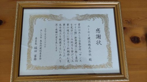 さて、先日お世話になりました、地元のあしな台集会所「サンスマイル館」の落成式にお招きいただき、何と感謝状までいただきました!!