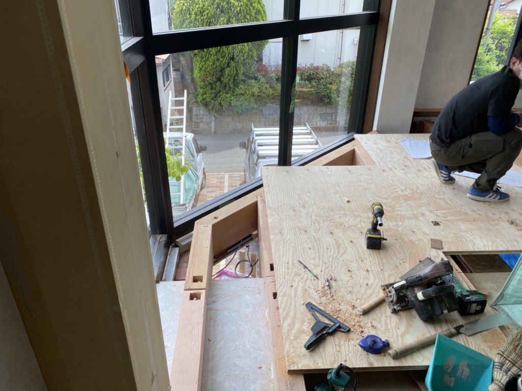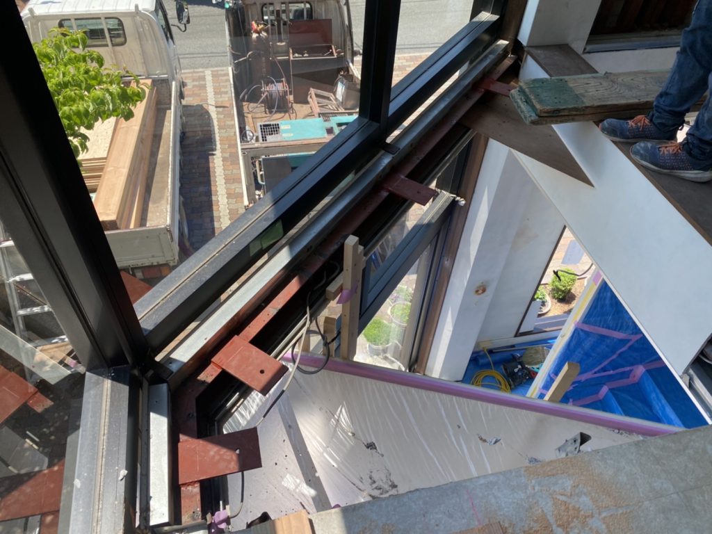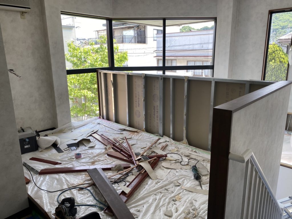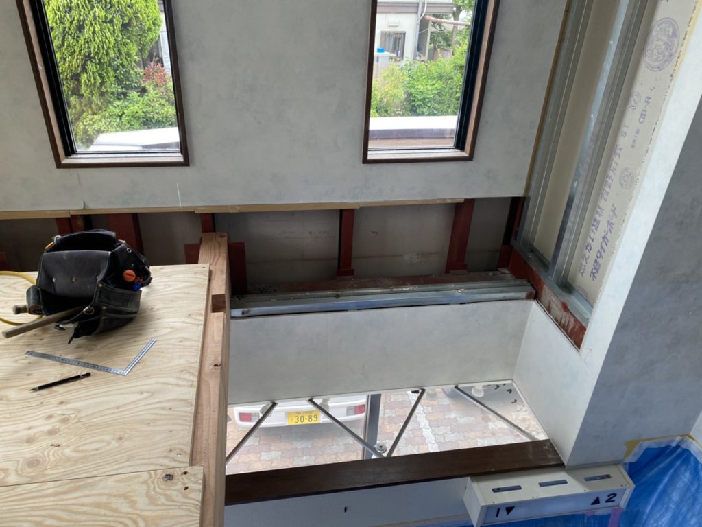 LGS下地の壁を撤去→鉄骨梁に受け金物を溶接→梁を入れました。