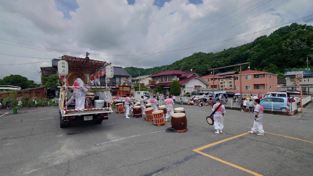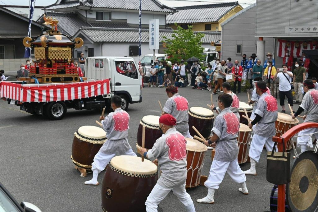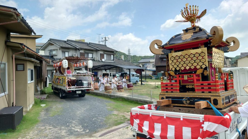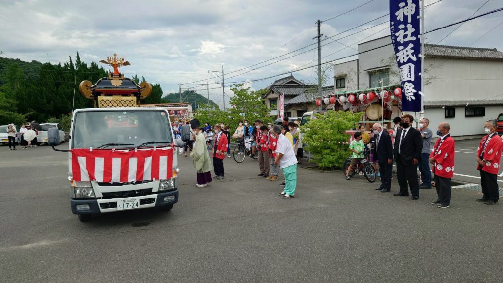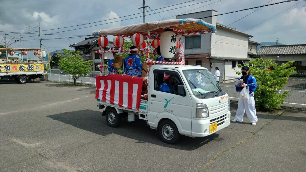 例年は40~60人ぐらいで担ぐのですが、今年は密を避けるため、車に乗せての巡幸です。