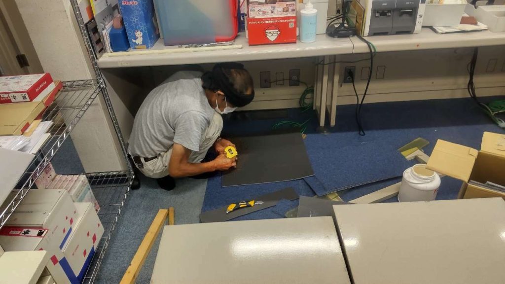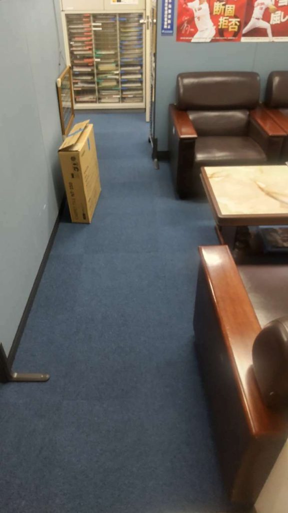 少し前ですが、お客様の店休日に事務所の床のタイルカーペットの貼替えをさせていただきました。