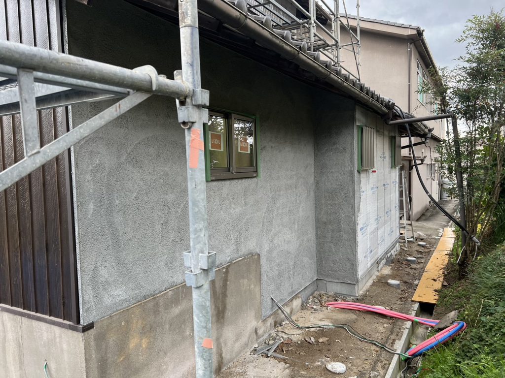 外部は左官屋さんが工事中です。