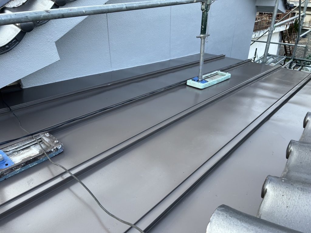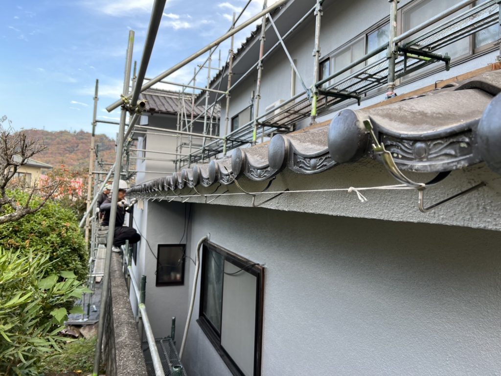 塗装工事も終わり、樋工事中です。