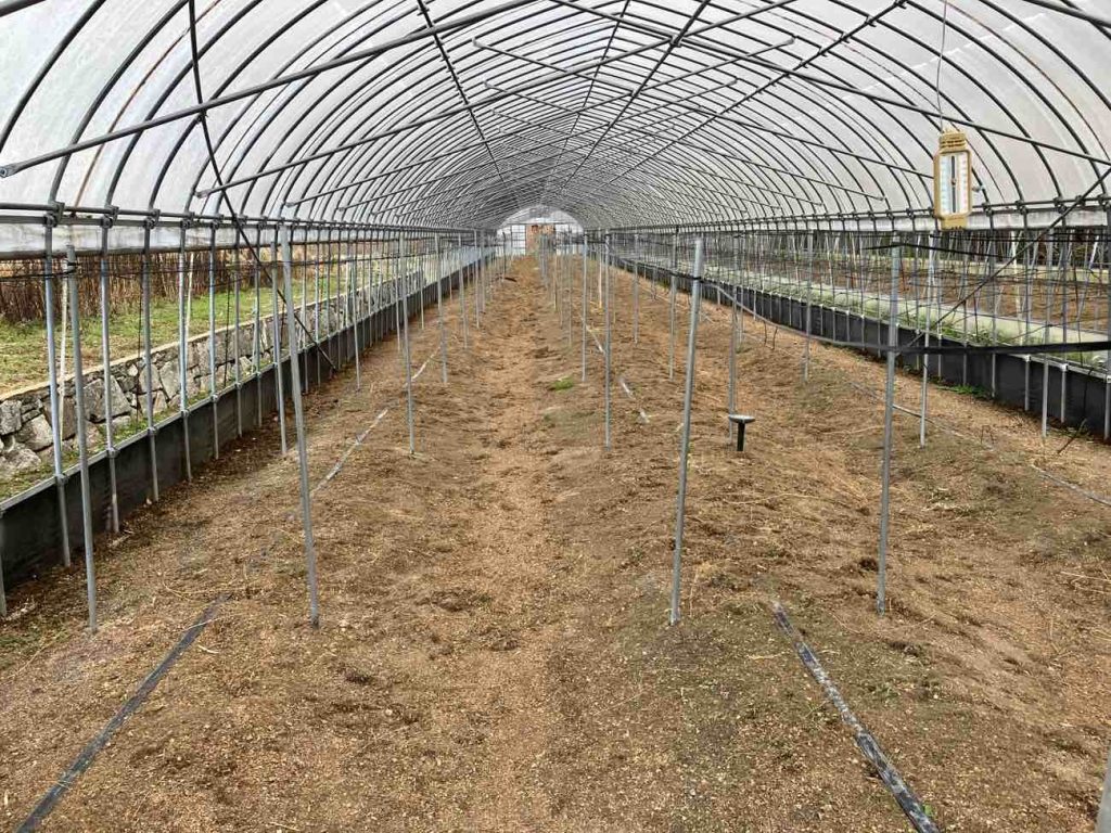枯れたものや昨年の堆肥を全てハウス外に出して処分し、畝をバーナーで消毒した後再び堆肥を敷いて保温を始めます。