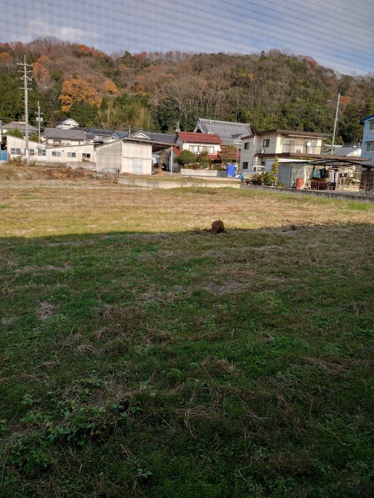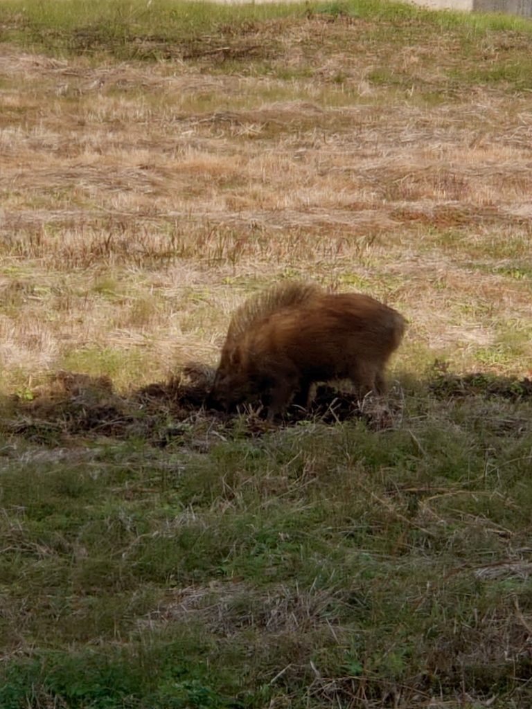 うり坊ではなく、大人?のイノシシで人目も気にせず餌を求めてひたすら雑草地を荒らしていました。