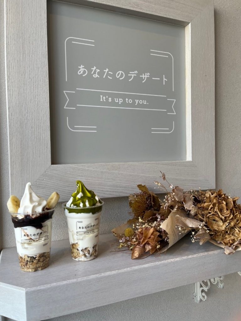 ジップアリーナ岡山の近所の「あなたのデザート」へ立ち寄りソフトクリームのバナナチョコとパリット抹茶を注文。