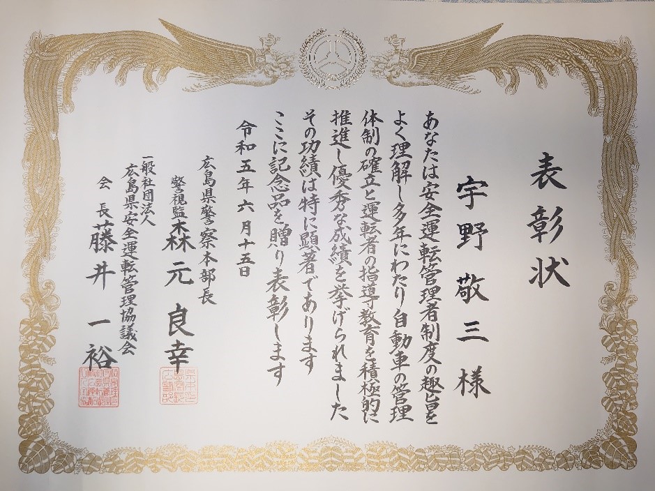 表彰内容は「優良安全運転管理者 広島県警察本部長・広島県安全運転管理協議会会長 連名表彰」です。