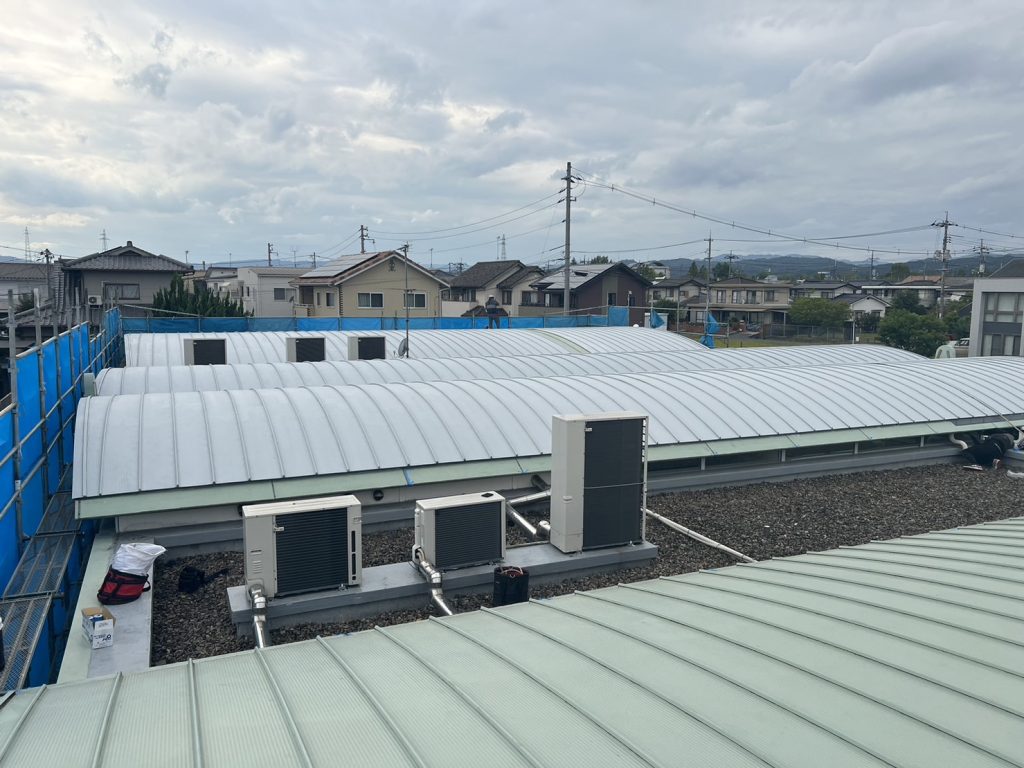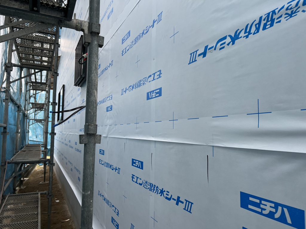 外部はシート張りが終わり、内部は大工さんが無垢のフロア施工中です!