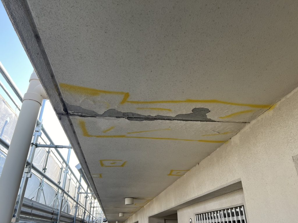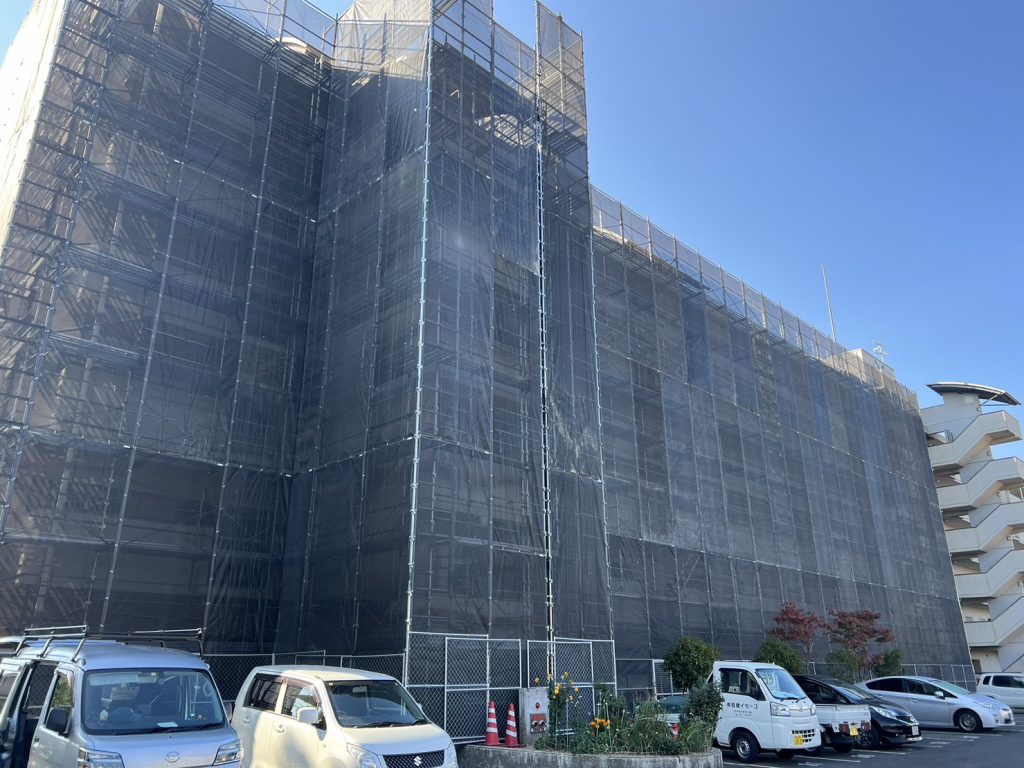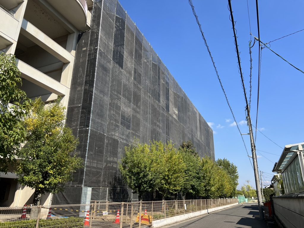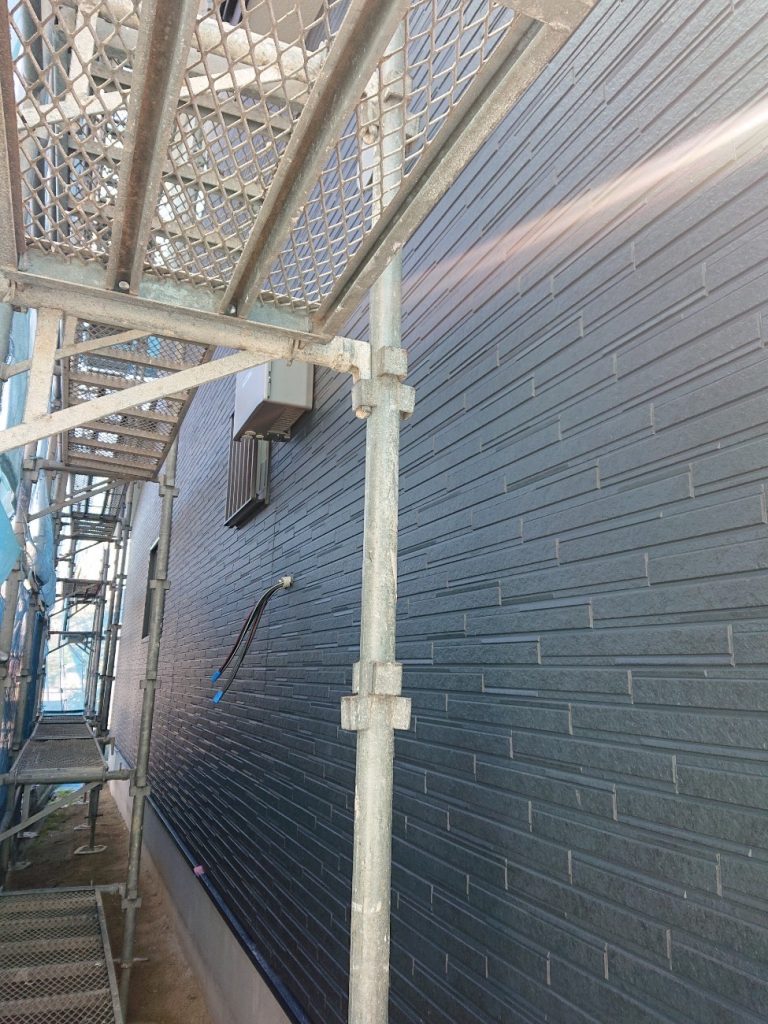 足場の組立が終わり、外壁調査中です。