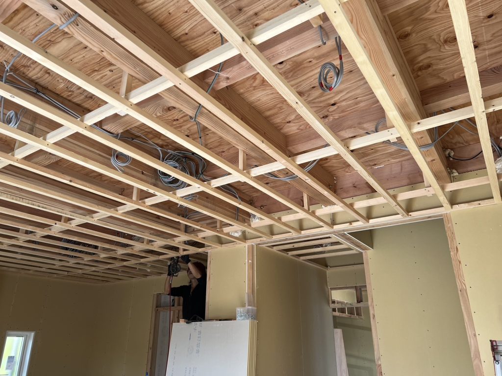大工さんが天井の下地をしています!