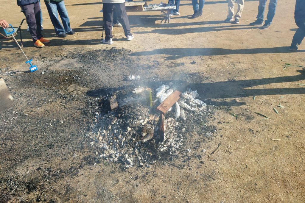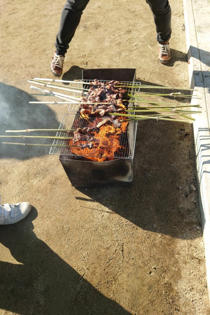 とんどが終わった後は、町内会長がイノシシ肉の串焼きを用意してくれて、役員さんとみんなで頂きました。