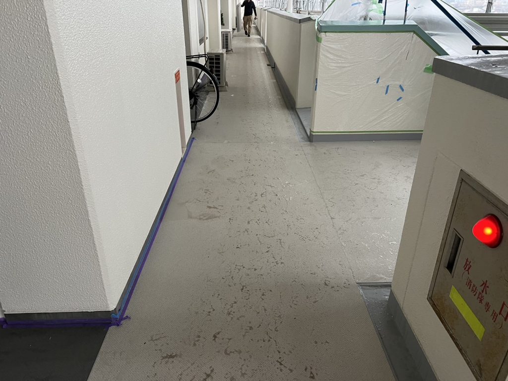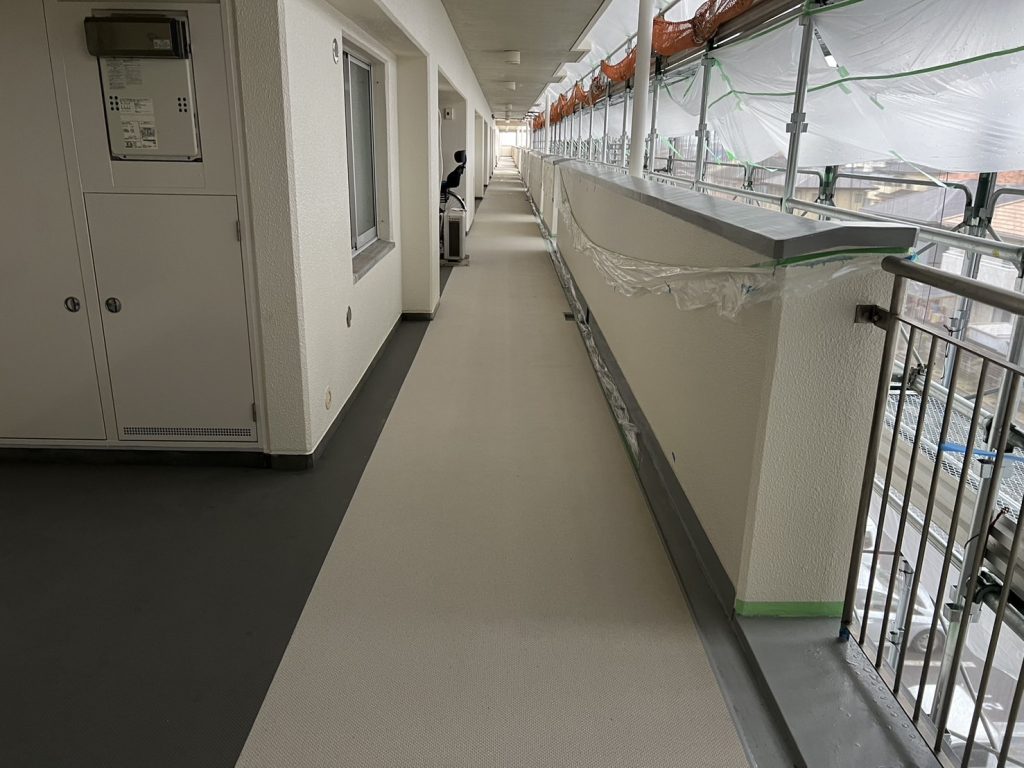床の長尺シート貼り工事中です。