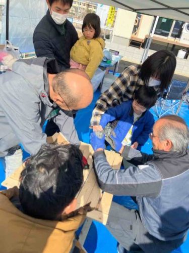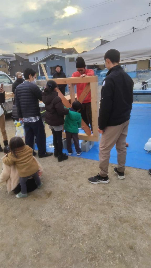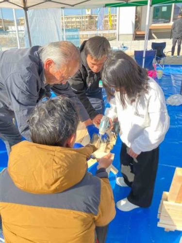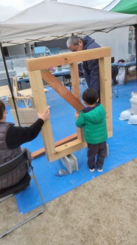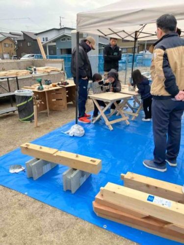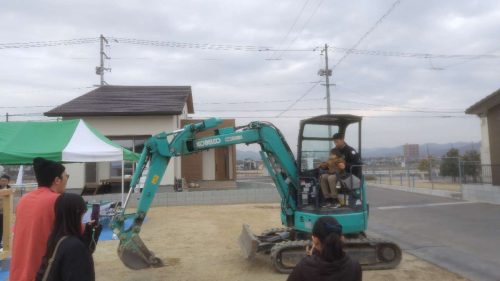 今回は自社の分譲地ということもあり、空いている土地が自由に使えるので、新たな試みとして、「チビッコ大工体験会」や「重機に乗って写真撮影会」など、やってみました。