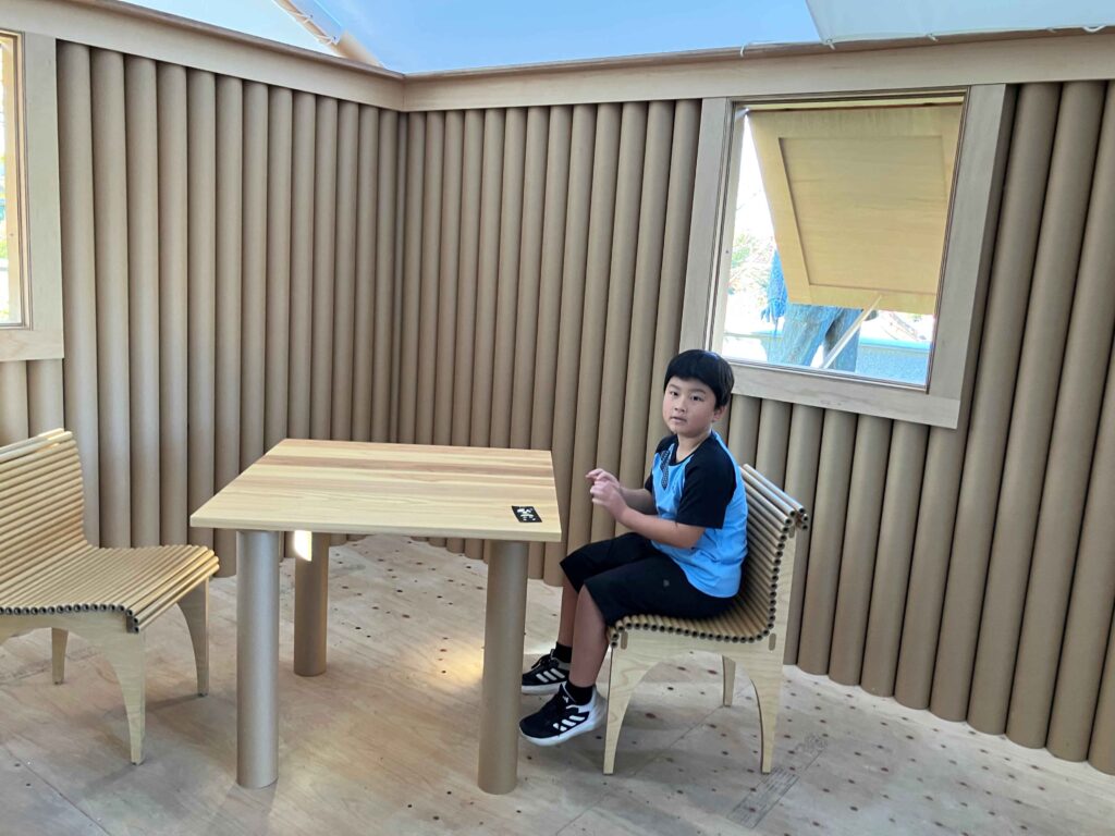 また、紙で建てられたハウスも紹介されていました。仮設住宅や、避難所などに使われている紙管を使って建てられた家にも入りました。