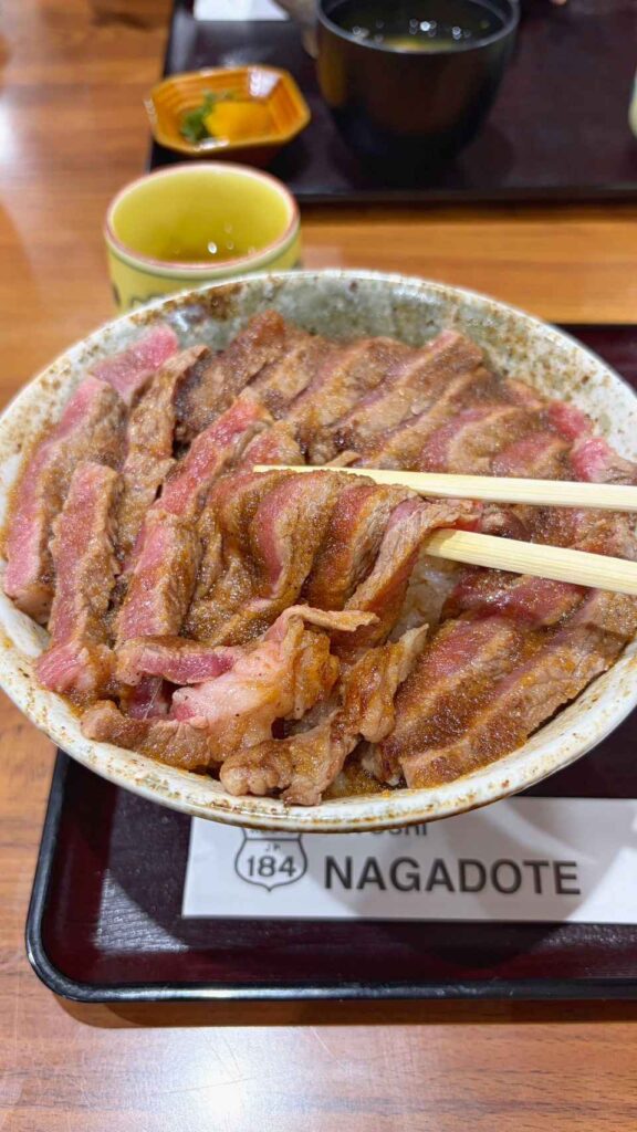 丼ぶりいっぱいに敷き詰められたステーキは、見た瞬間にテンションが上がる迫力。