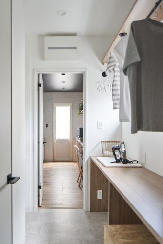 朝の混雑を解消するため、脱衣所と洗面室を分け、また動線が一方通行にならない様に計画した機能的お家です。