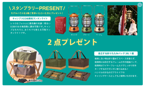 モデルハウスを3棟ご見学頂いた方にランタンライトと折り畳みバックのプレゼントがあります!