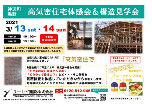 3月13日(土)14日(日) 高気密住宅体感会&構造見学会 開催!!