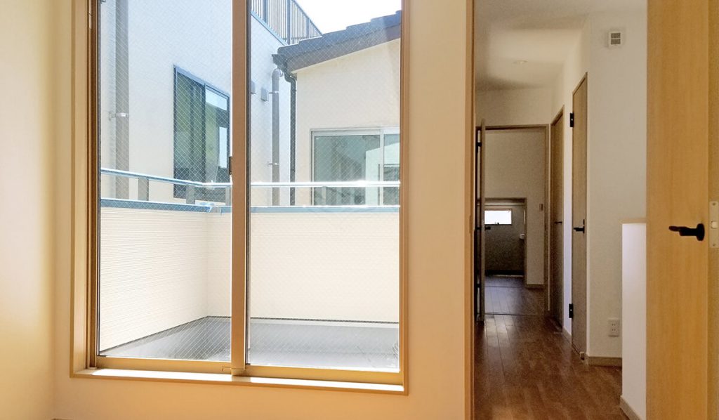 坪庭の区画を活用して、二階にはバルコニーを設置。