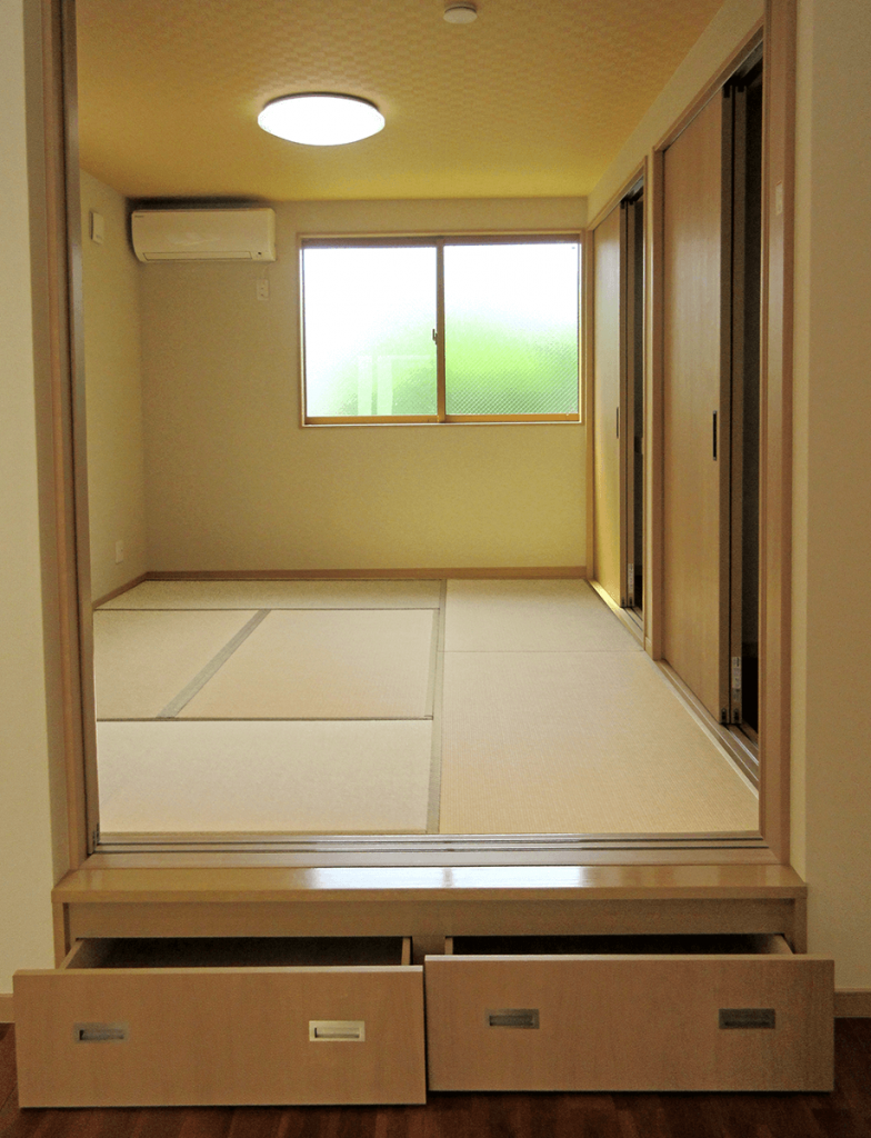 小上がりを活用した段差収納は、リビングのお片付けにも一役買います。
