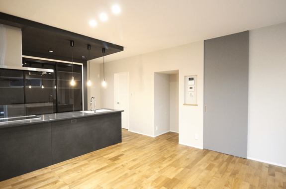 扉ではなく壁で区切られているので、圧迫感のない広々としたリビングになっています。