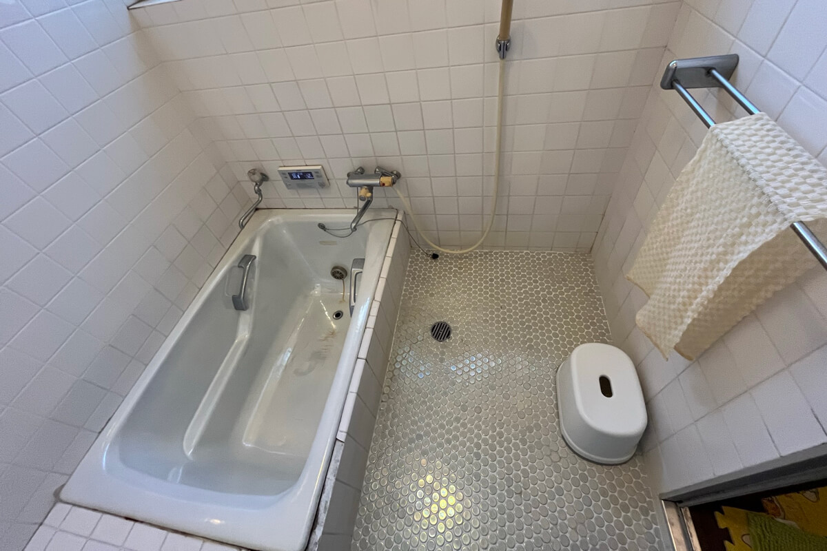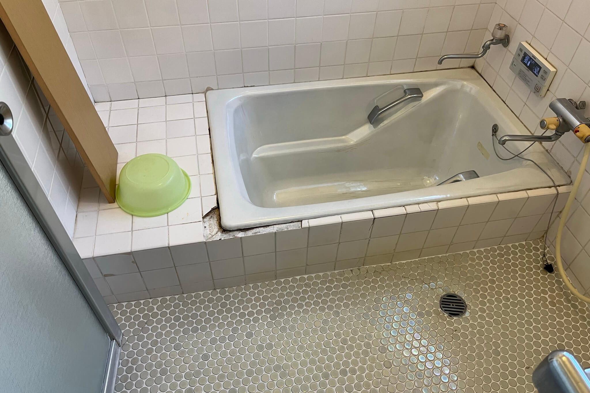 浴槽のまわりは老朽化し、タイルが剥がれたりヒビが入っていたりしていました。