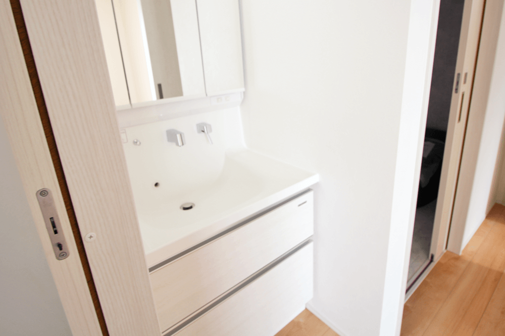 お風呂を使っている時でも気兼ねなく洗面台を使えますし、トイレ横に配置されているので、トイレの手洗いとしても兼用して使えます。