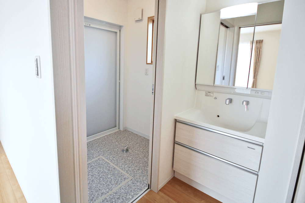 トイレ、お風呂、脱衣所などの水回りはまとまっていますが、洗面台を独立させることで、使い勝手が格段にUP!