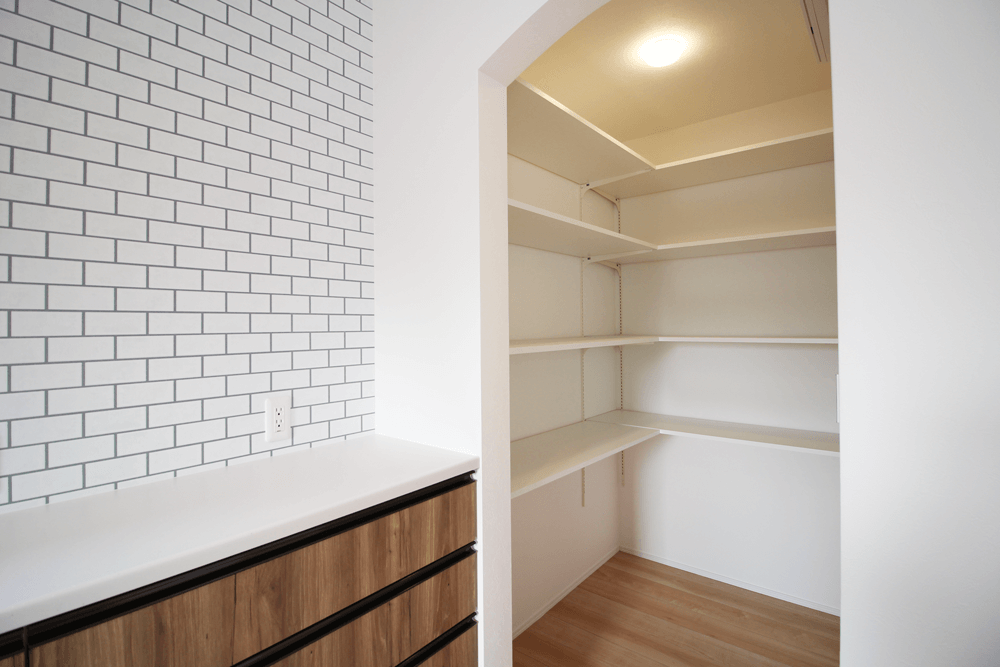 物が多くなりやすい場所なので、収納スペースを多く設け、パントリーも設置!