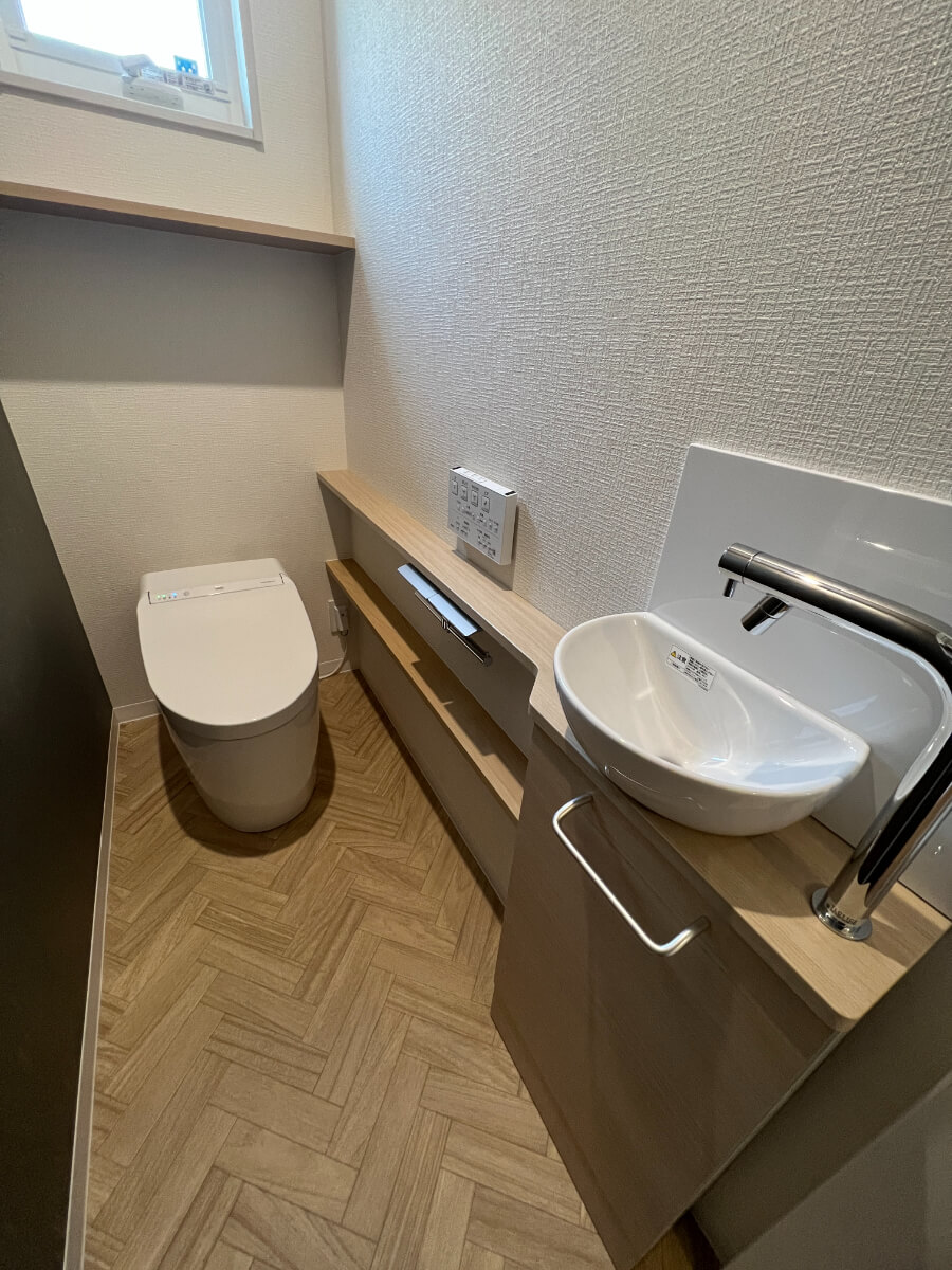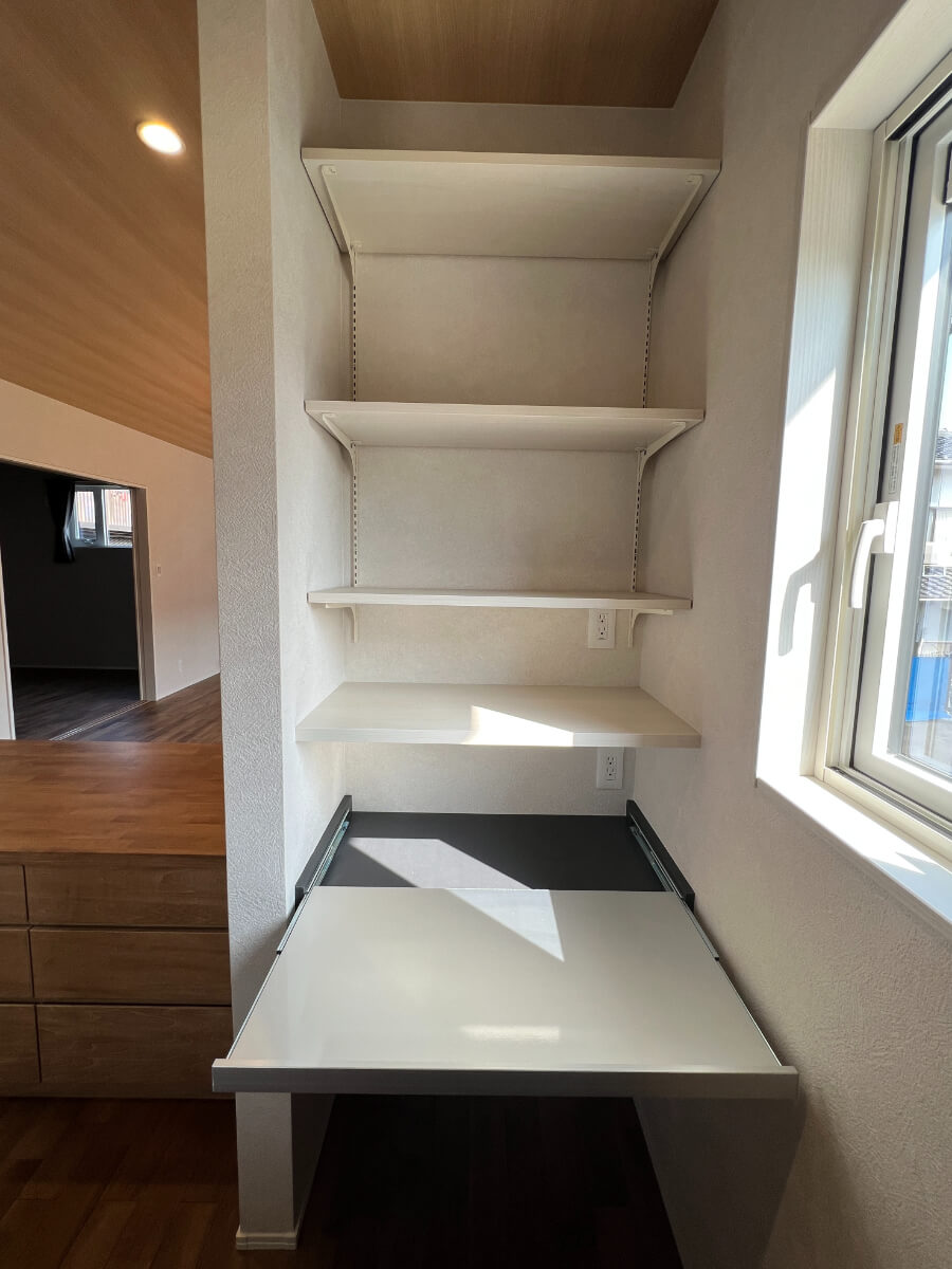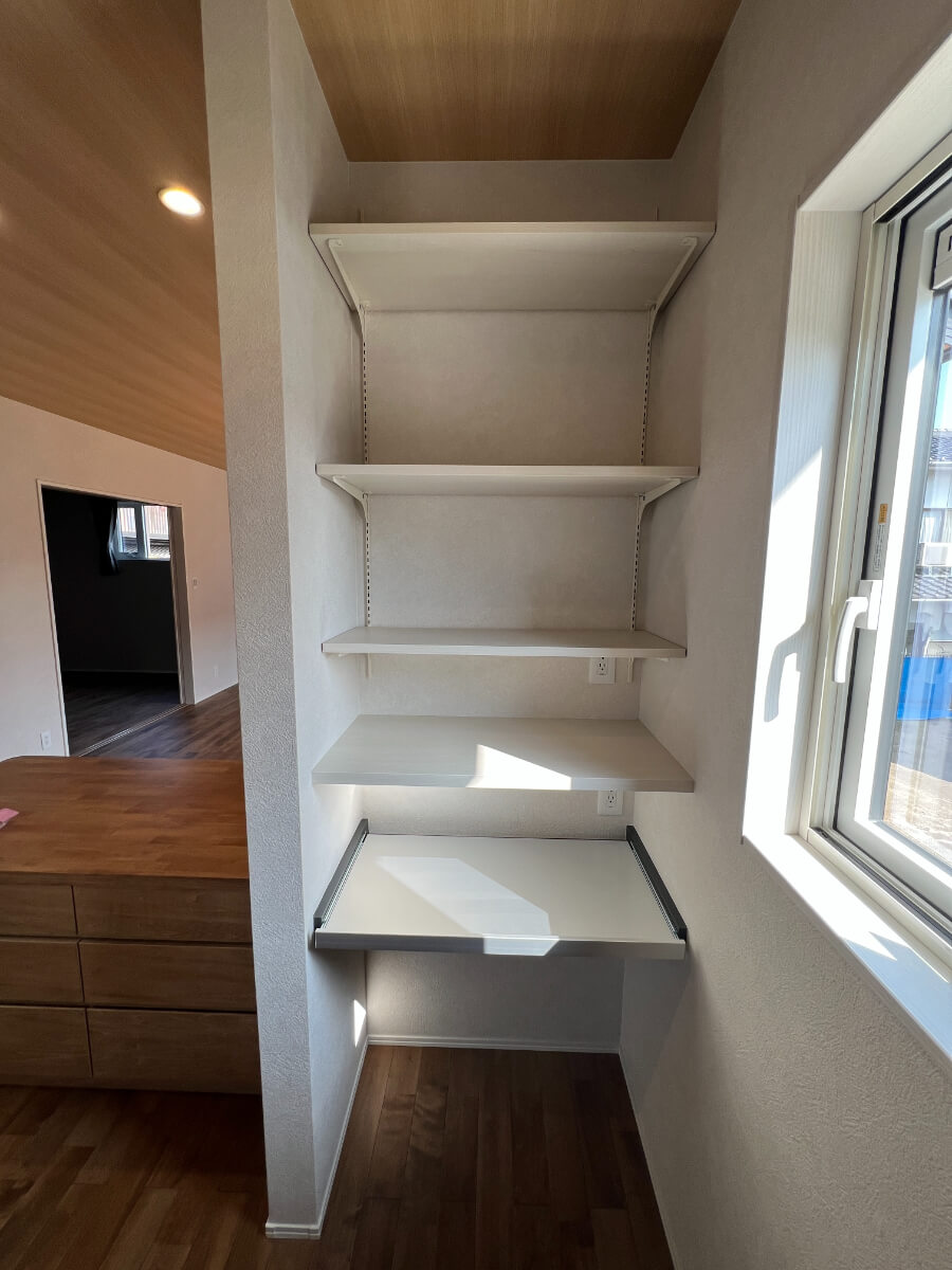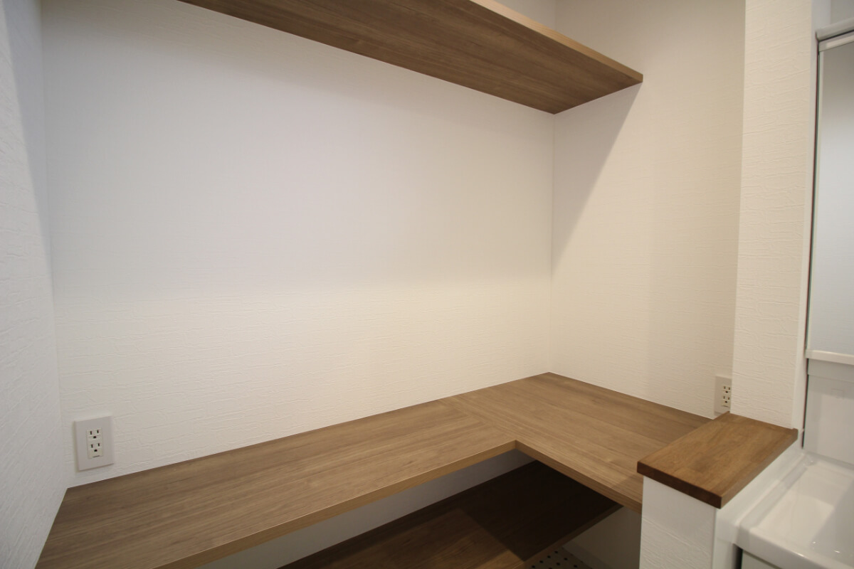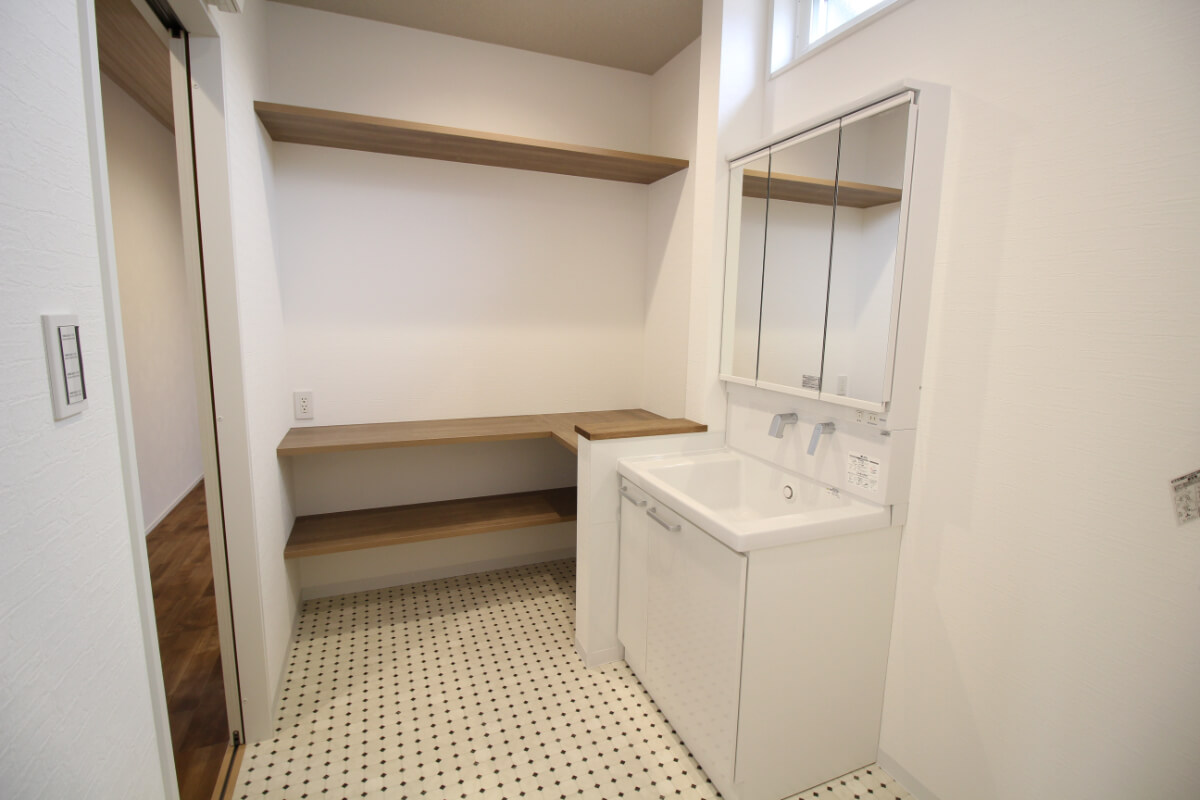 脱衣所にも造作棚を設置することで、家事動線も楽になります。
