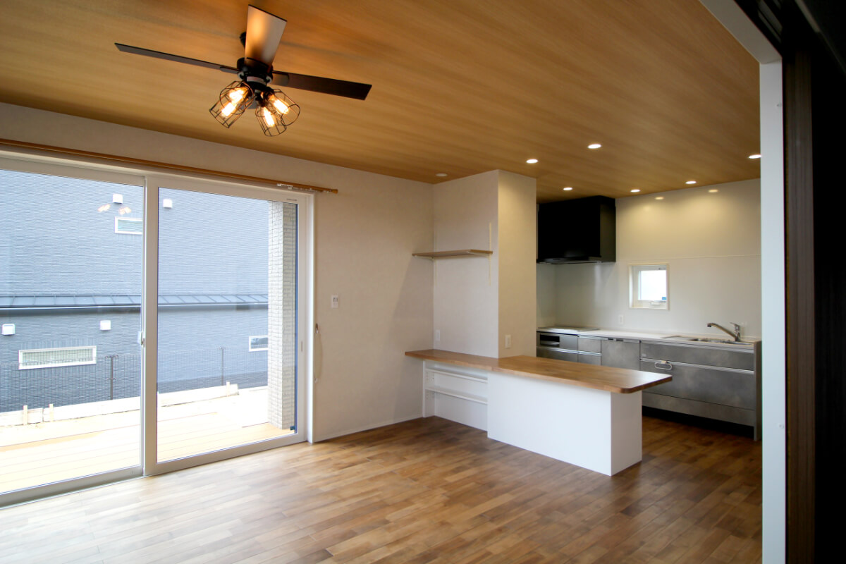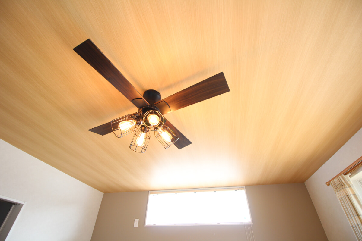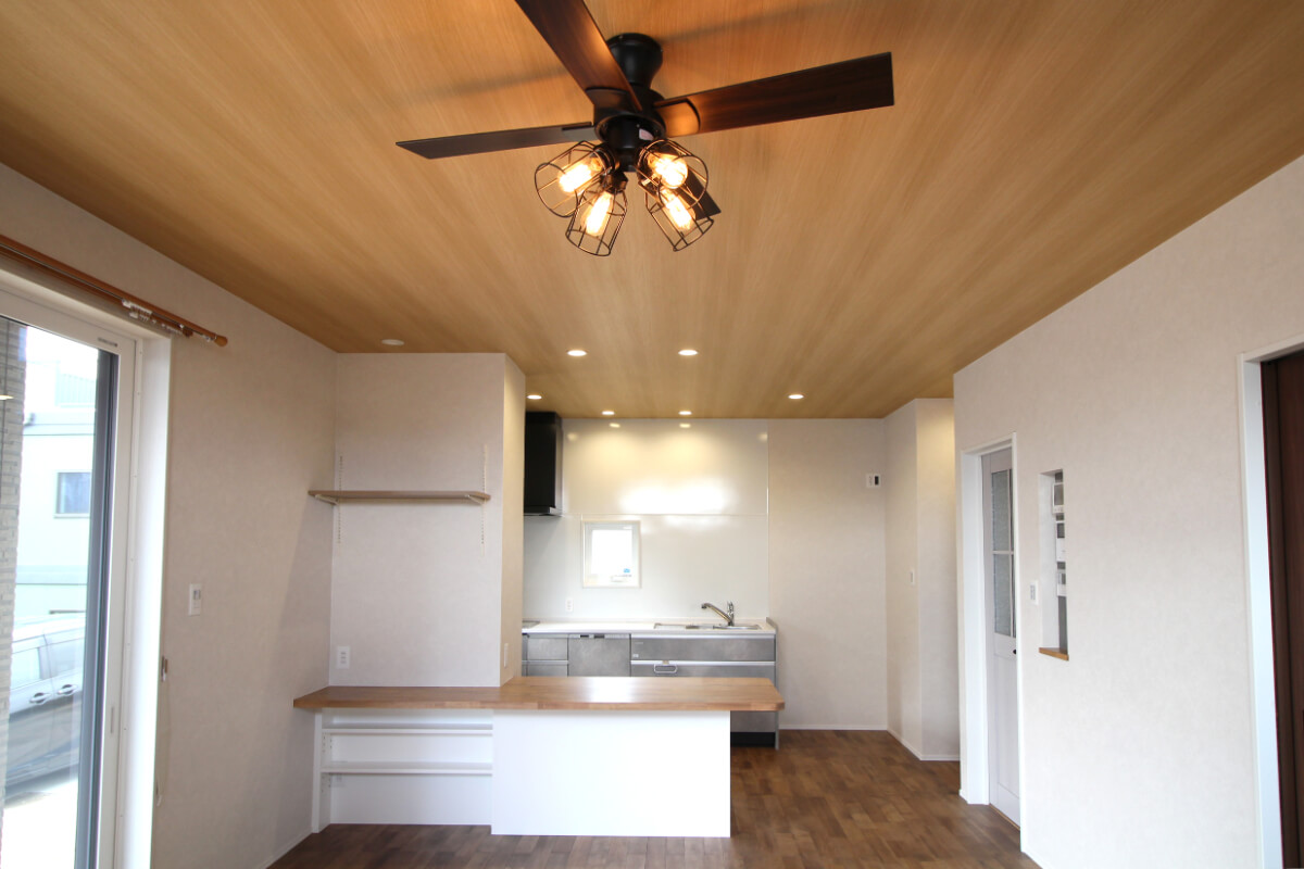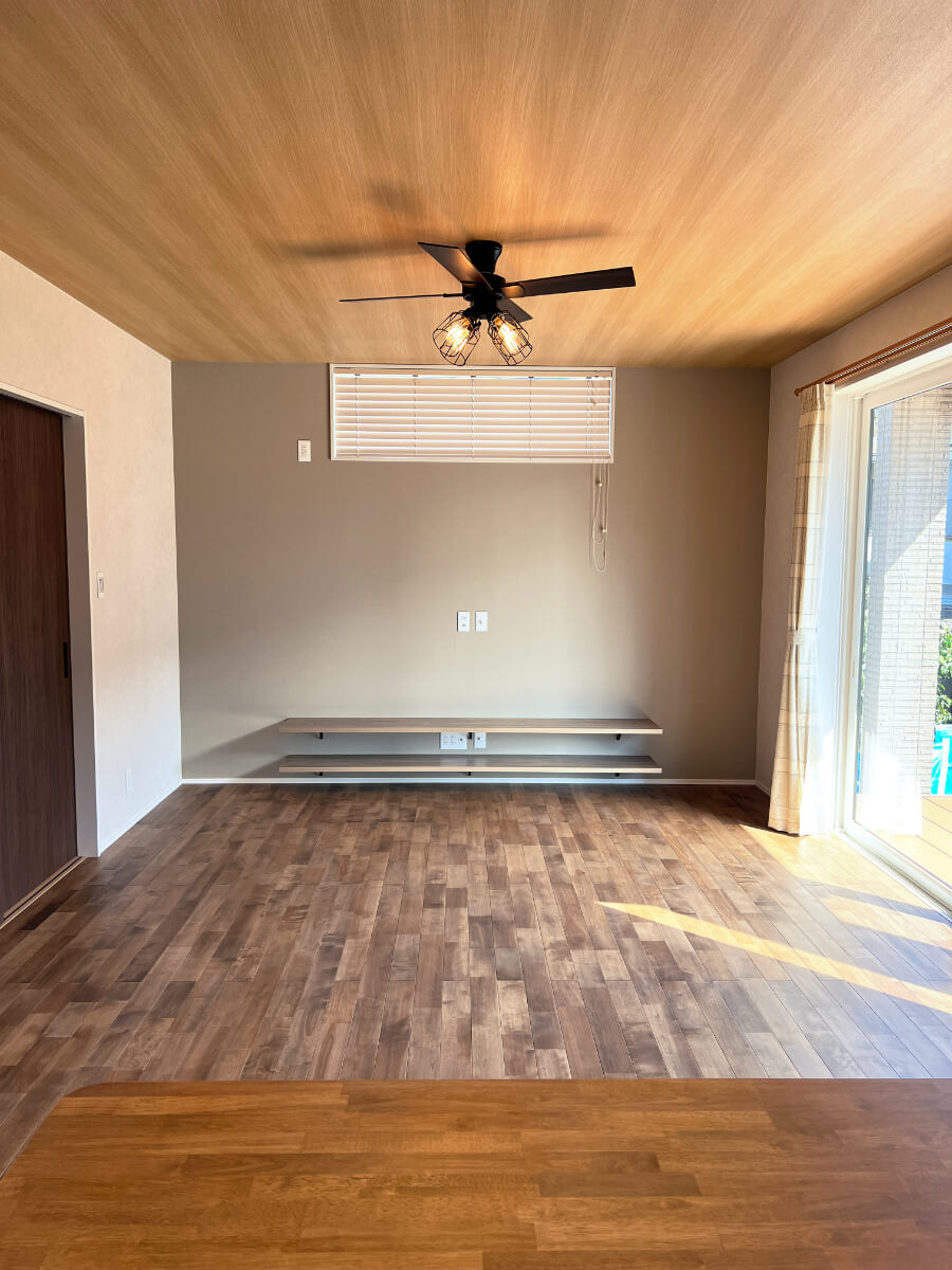リビングのメインとなる照明には、フローリングの木目との相性抜群のライト付きのシーリングファンを使用し、ヴィンテージな雰囲気に仕上がっています。