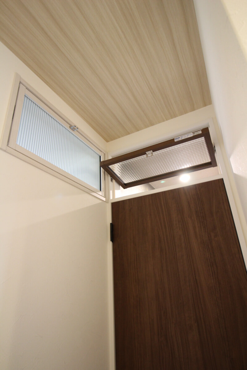 トイレドアの上部には開閉式のガラスの欄間を採用しました。