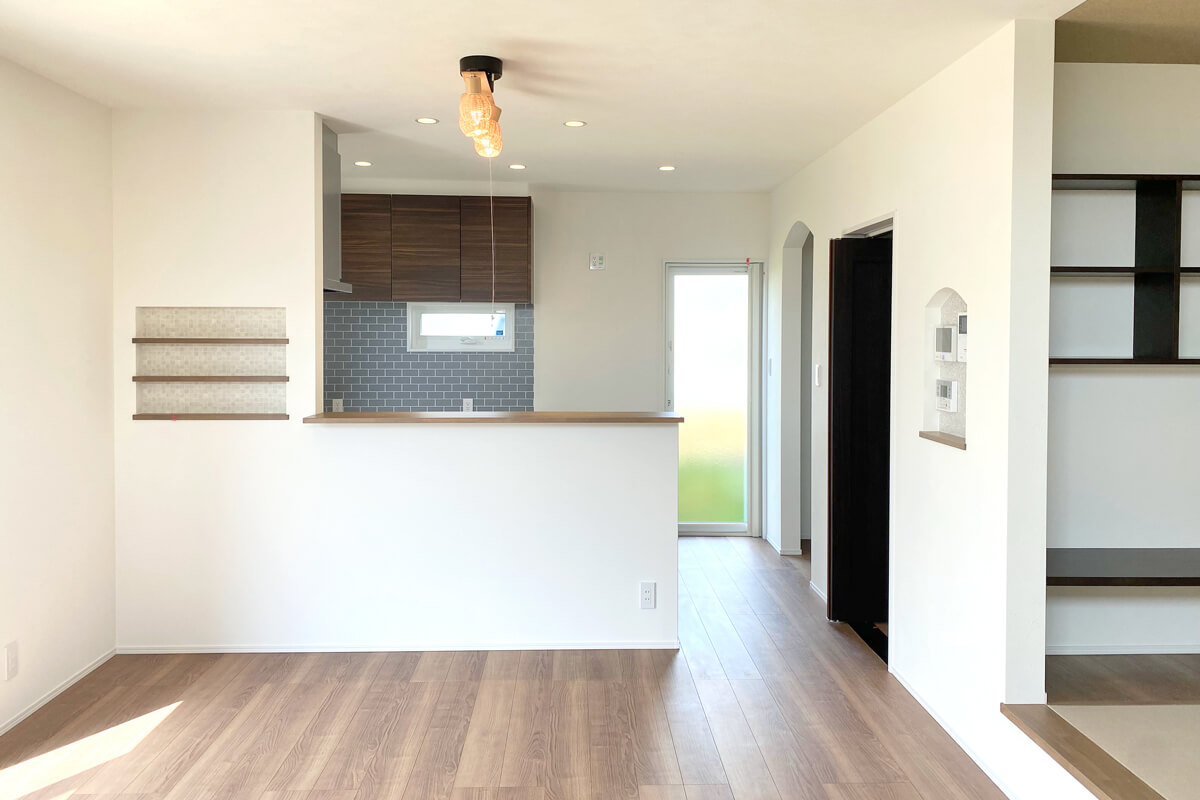 ダークブラウンのフローリングと白い壁のリビングは、リラックスできる落ち着いた空間になっています。