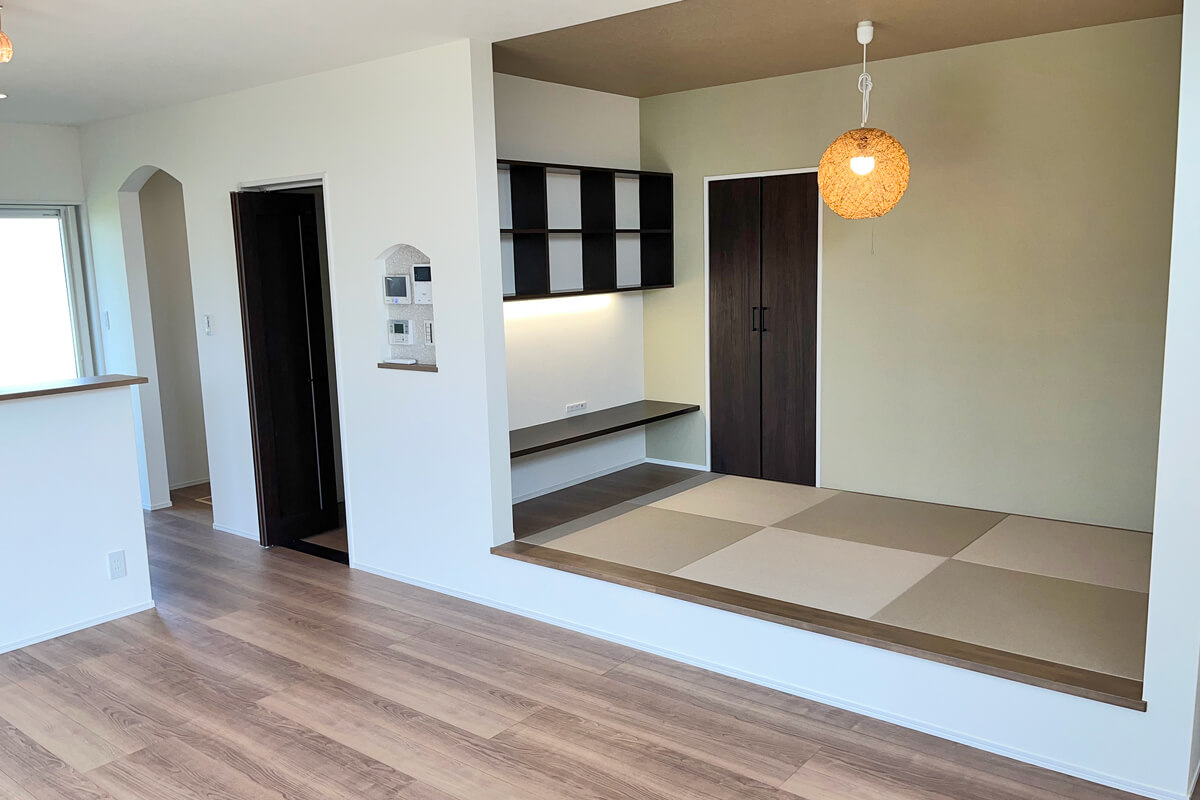 また、モダンな雰囲気の小上がりの和室は、段差に腰掛けたり、寝転んだり、子どもたちと遊んだり、家族のくつろげる場所になります。