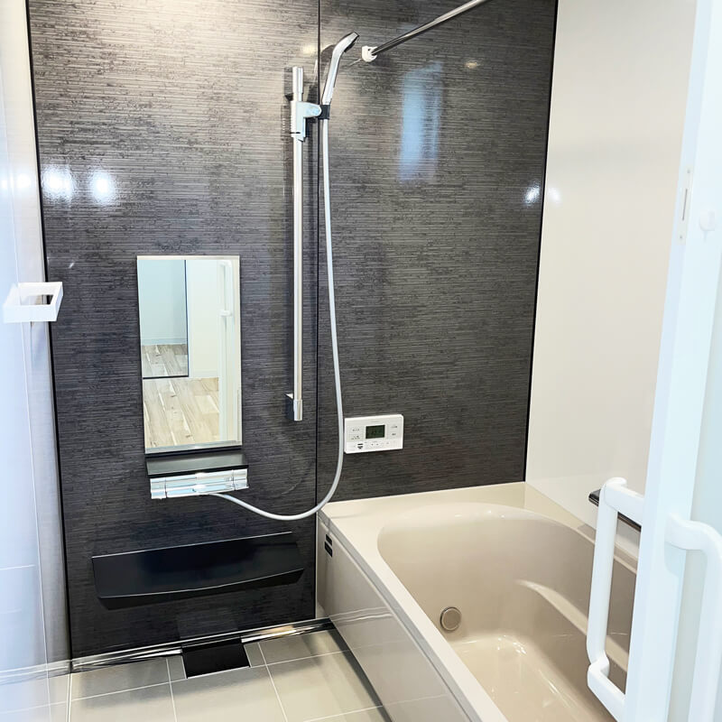 ダークカラーに玄関周りの木目がアクセントになった外観は、シックな中にも温かみを感じられるデザインに。