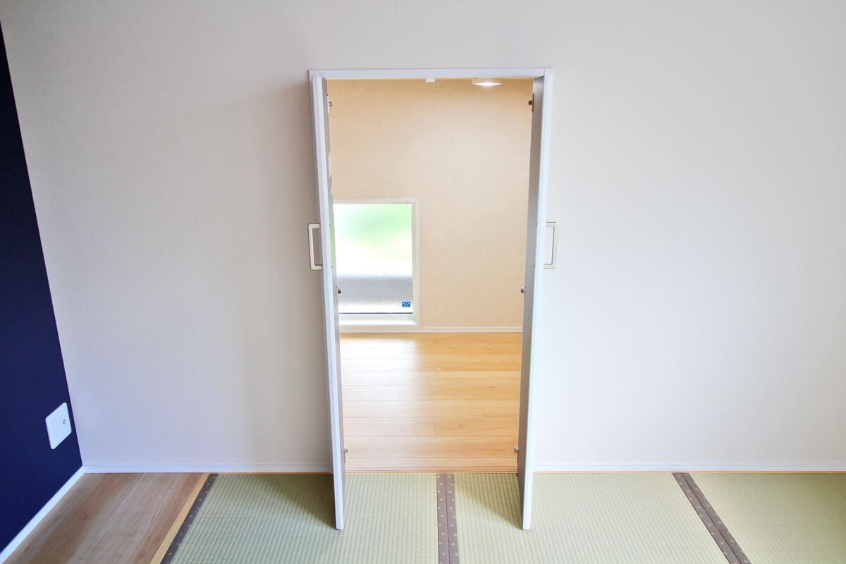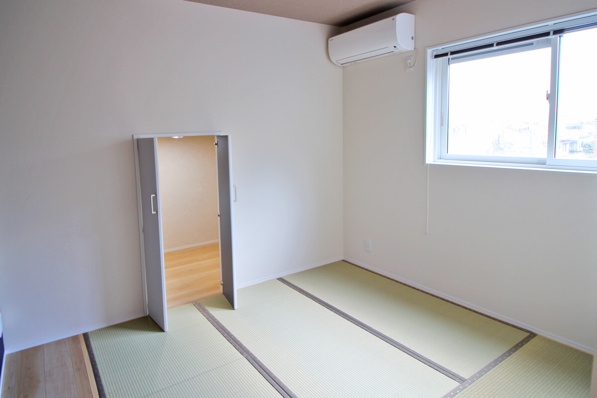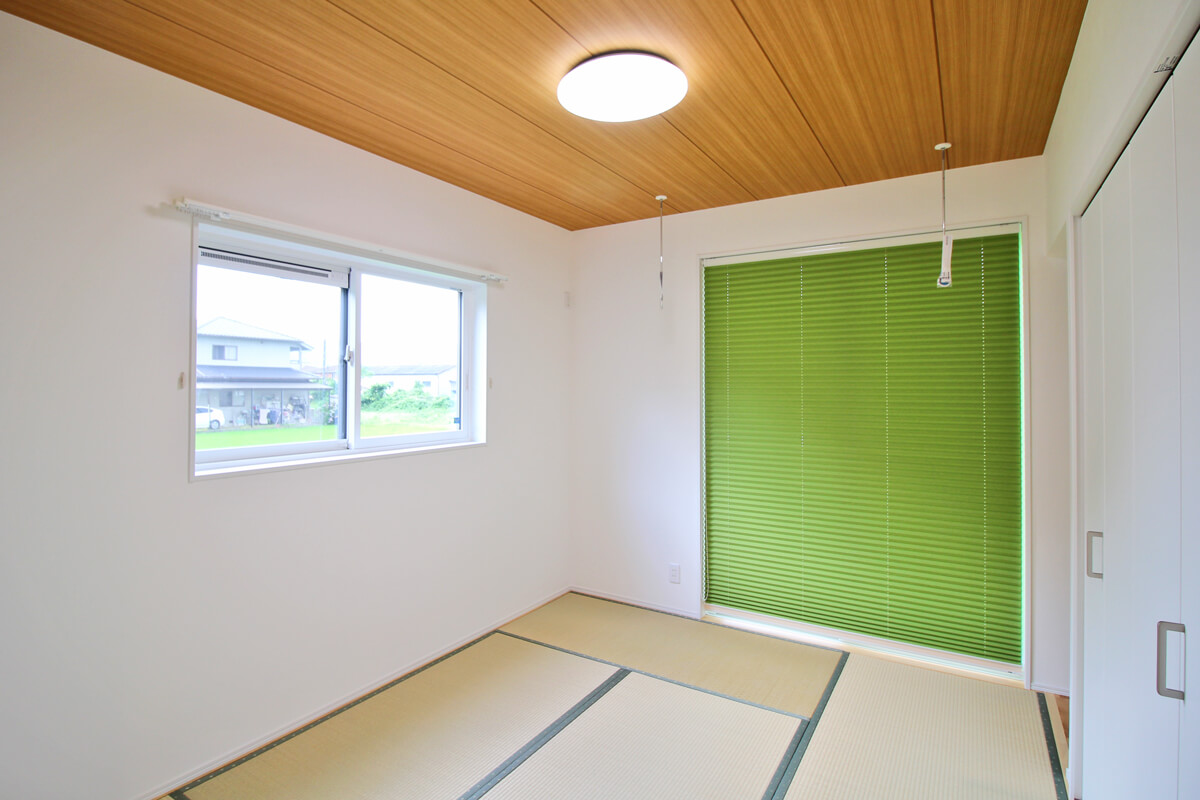 グリーンのブラインドがおしゃれな和室は、床の間を使って季節の花を飾ったり、趣味のものを置くことで、華やかな空間に。