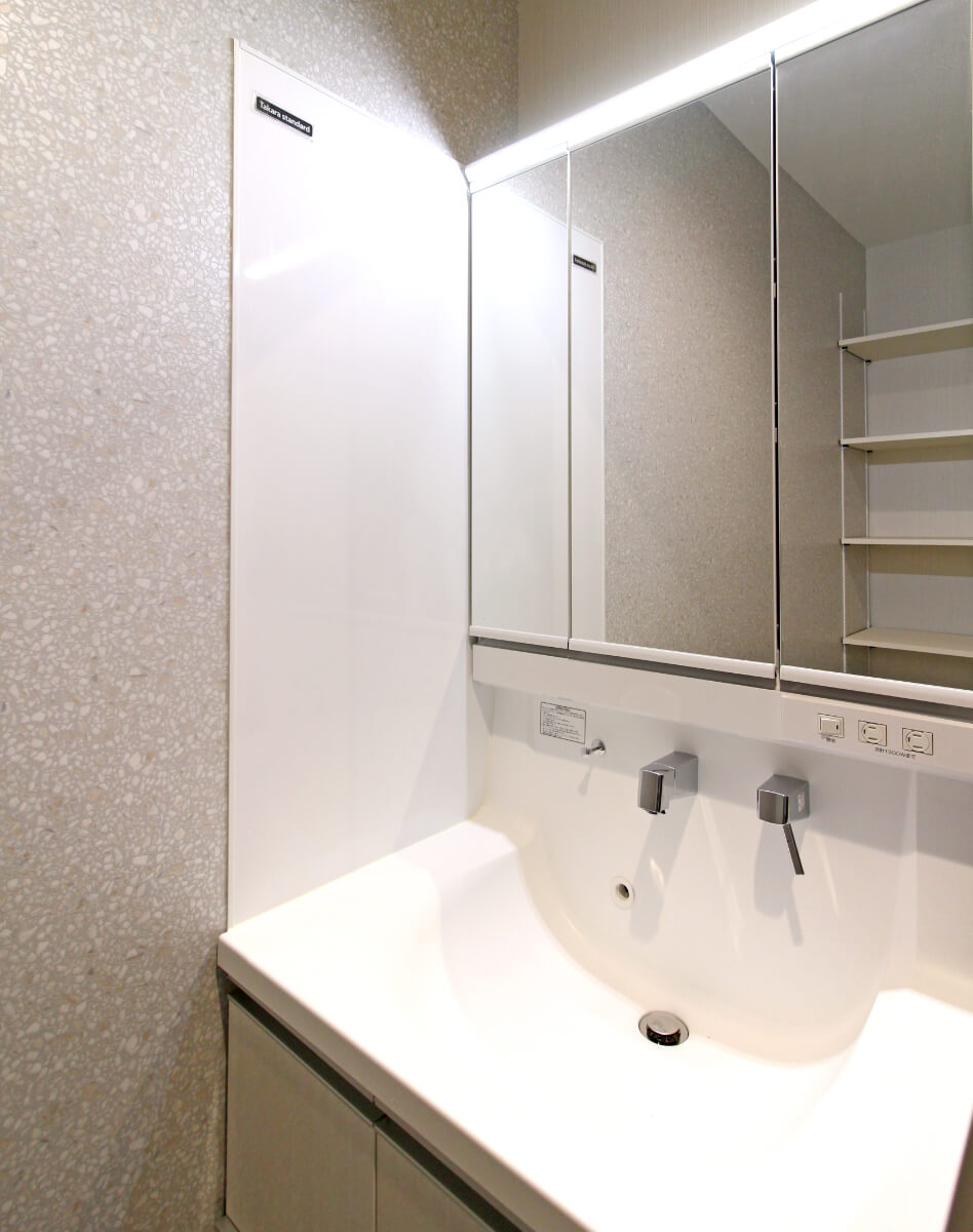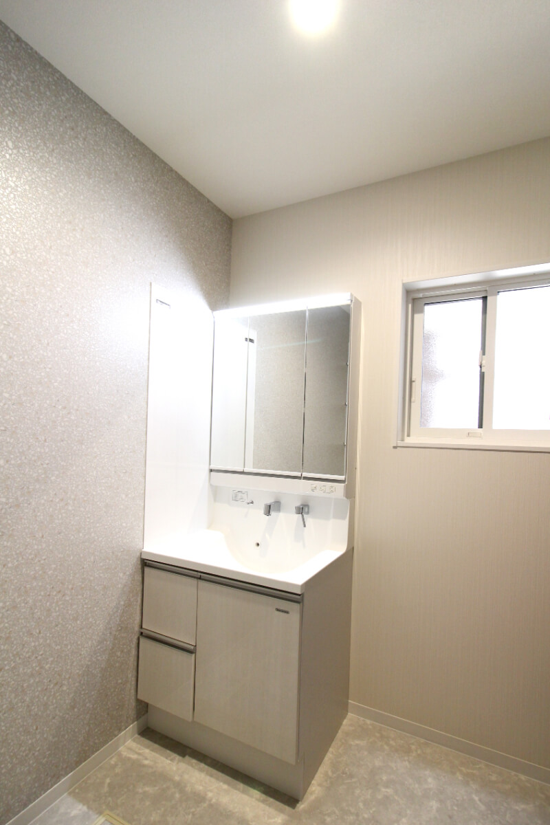 脱衣所の洗面台は、人気の三面鏡化粧台。