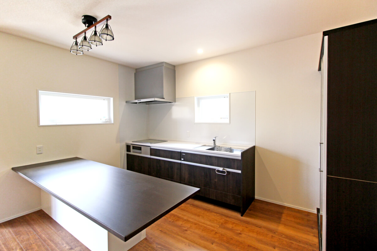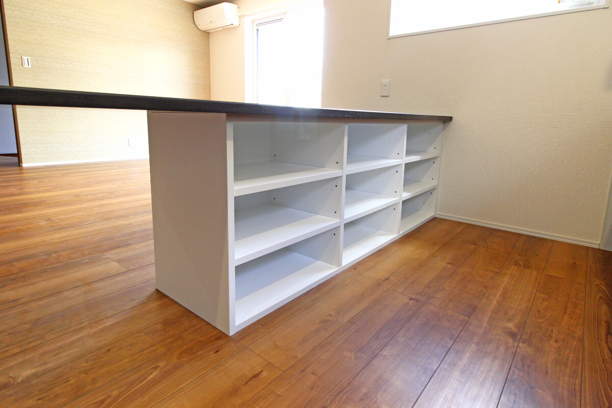広々としたキッチンカウンターテーブルには、細いキッチンアイテムを収納できる棚を備え付けています。