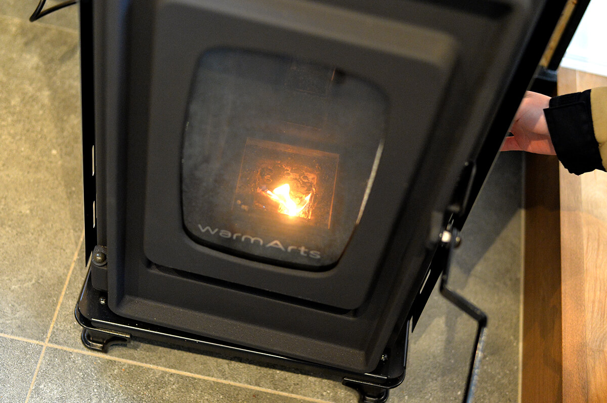 ペレットストーブはエアコンと異なり上下の温度差が少なく、炎と扉の鋳物から発せられる遠赤外線の効果で、お部屋全体をじんわり温めます。