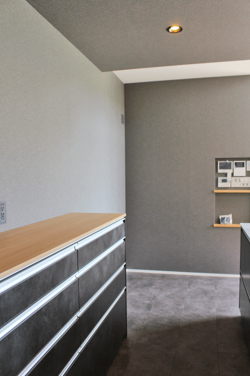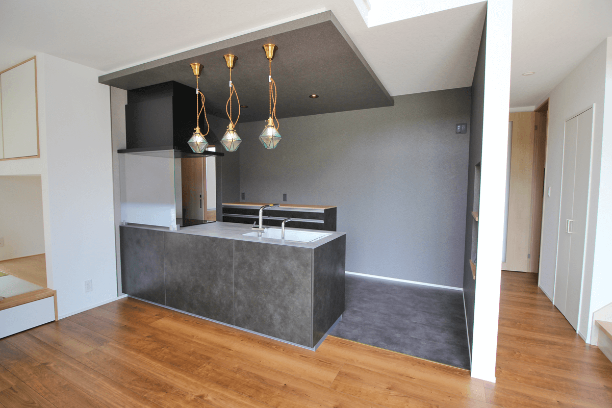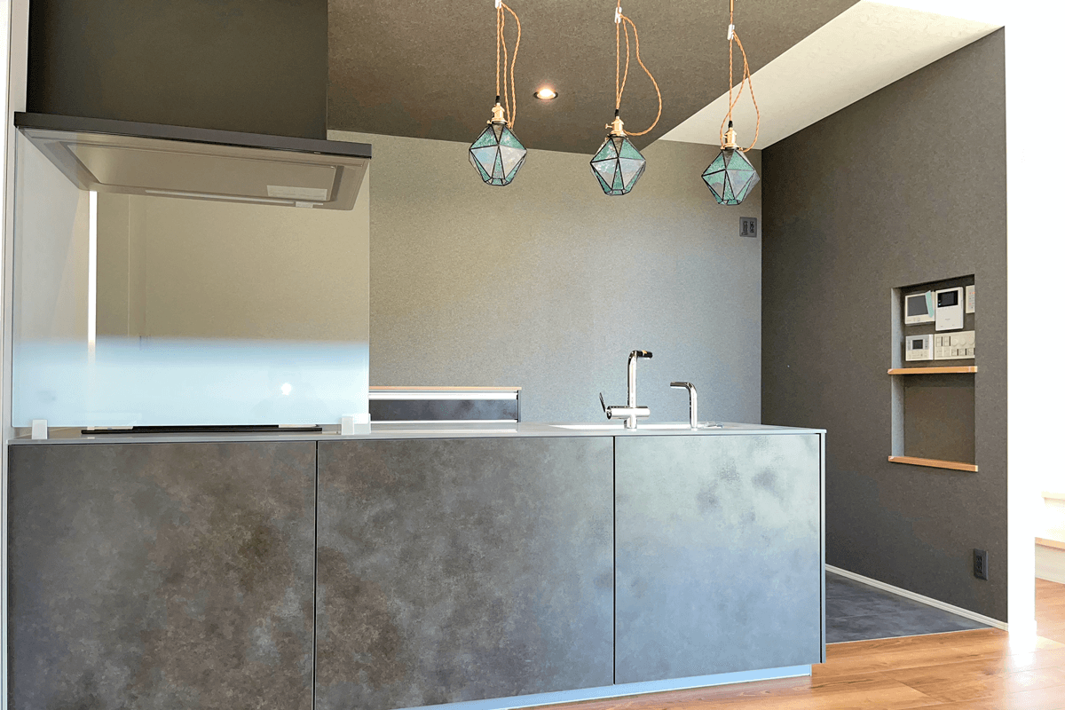 グレーで統一したシックなキッチンスペースは、ペンダントライトがアクセントになっています。
