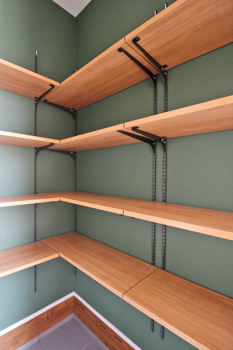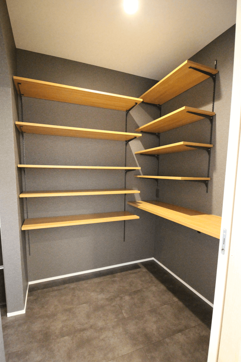また、キッチンのすぐ隣に大容量でL字型のパントリーを設置しました。