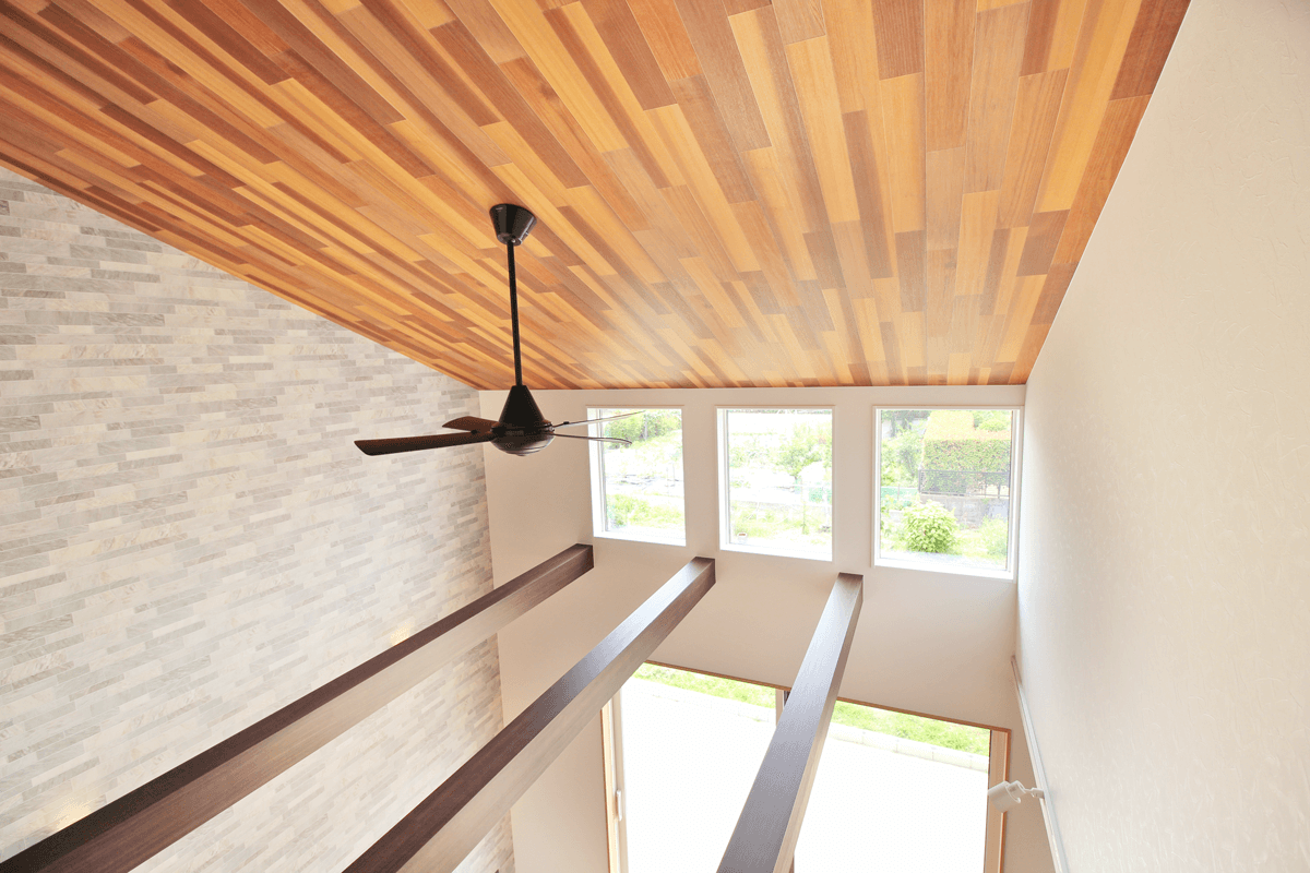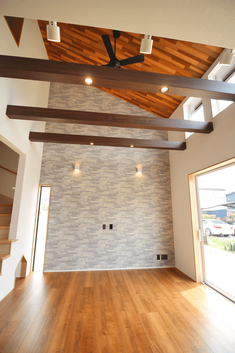 おしゃれな勾配天井の吹き抜けから陽の光が差し込むことで、明るく開放感あるリビングに。