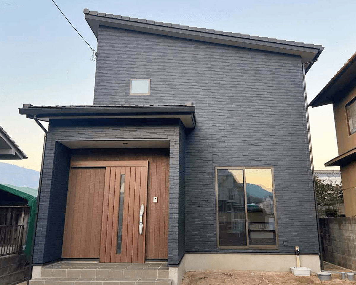 シンプルな黒い外壁と勾配ついた屋根がスタイリッシュな印象を与えつつ、