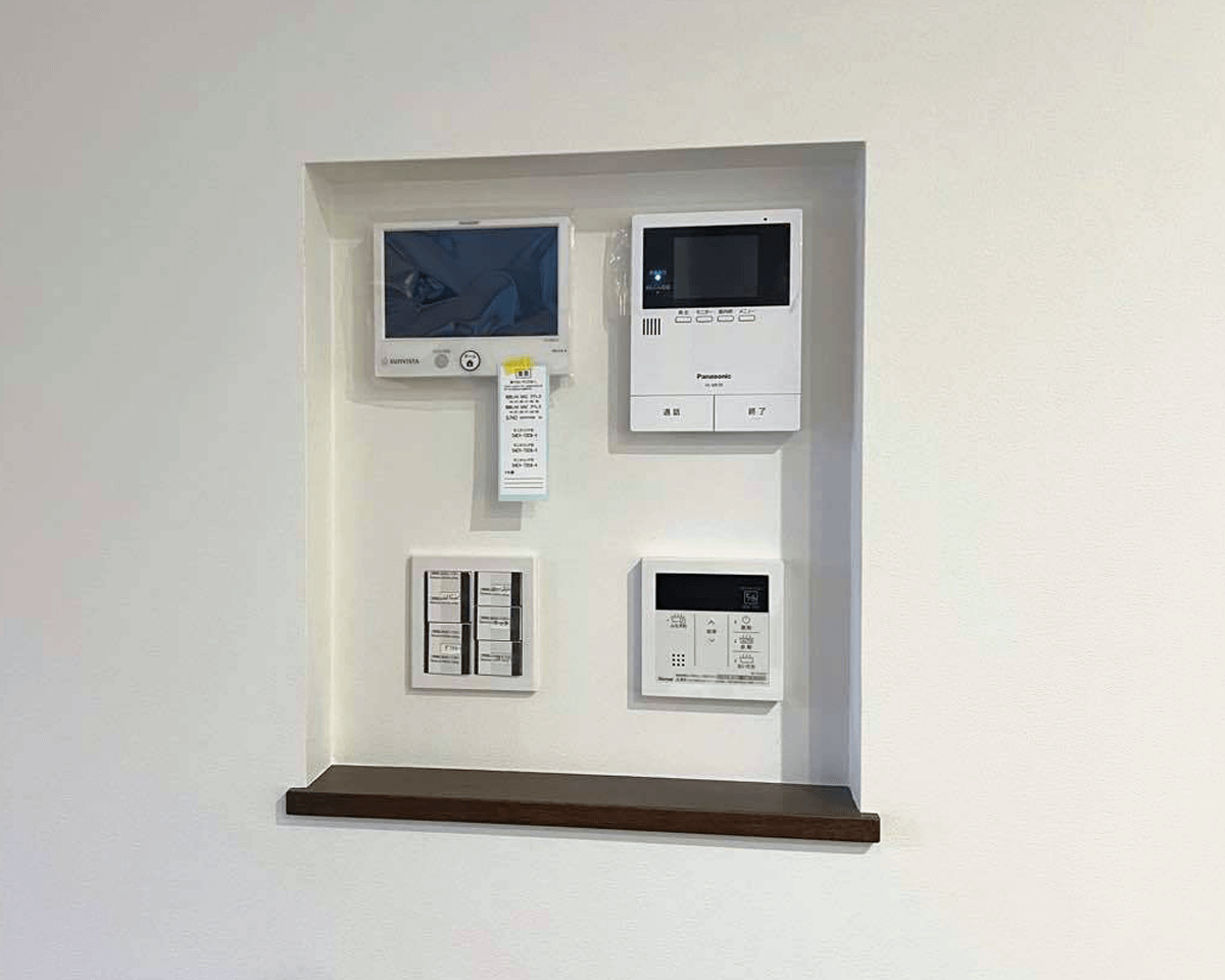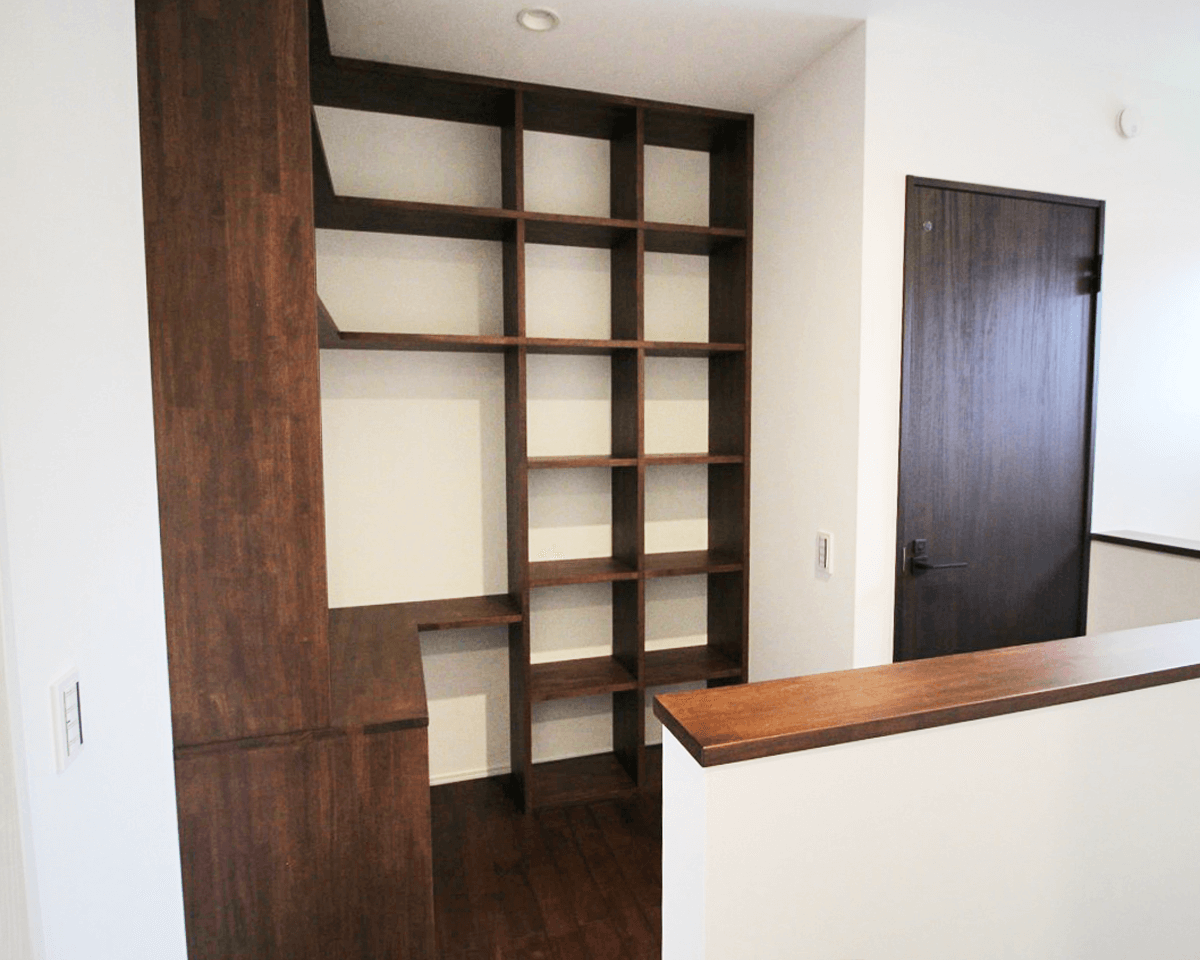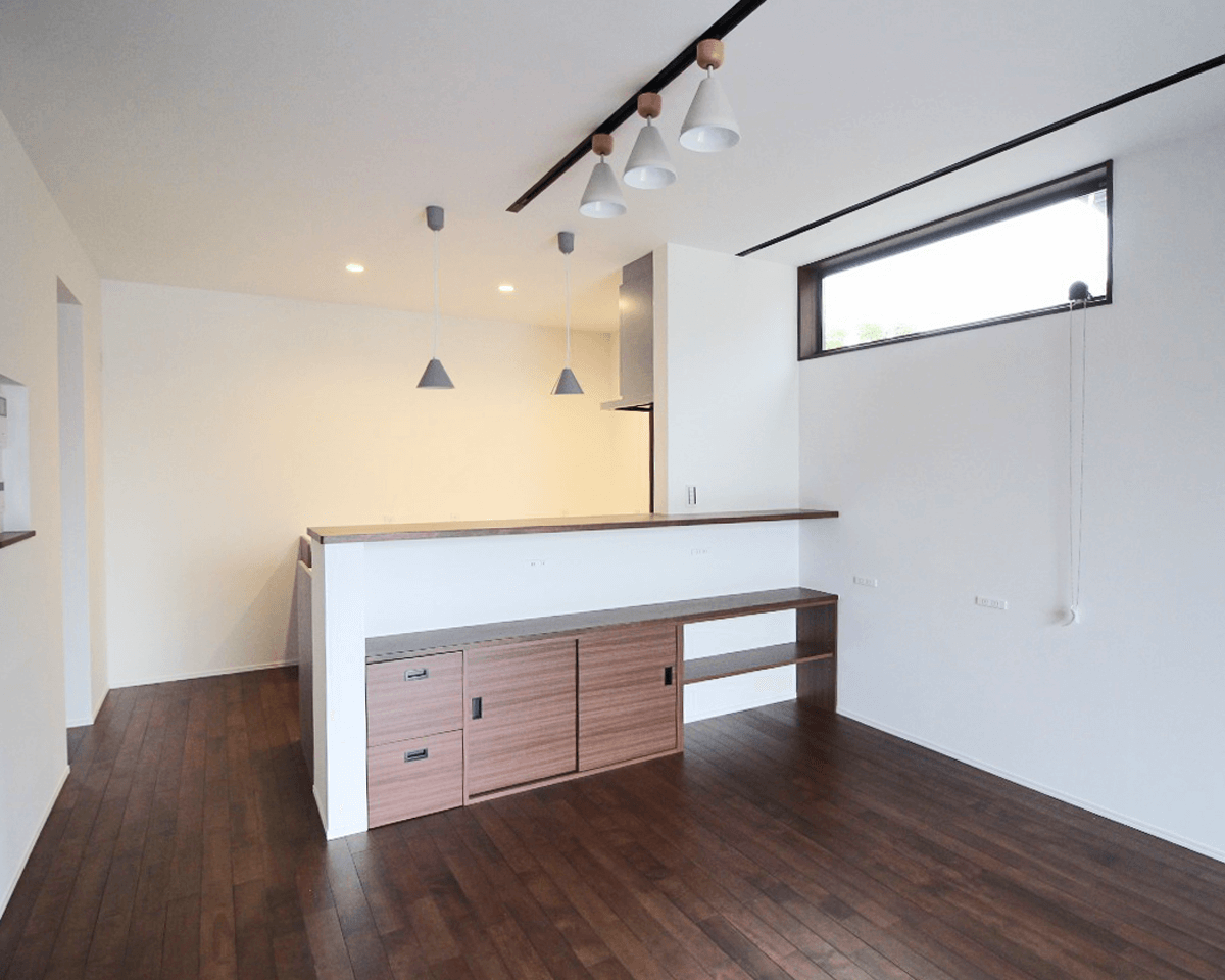 キッチン裏の壁に収納スペースを設けることで、隠す収納・見せる収納にも使え、スッキリ片付け上手に♪
