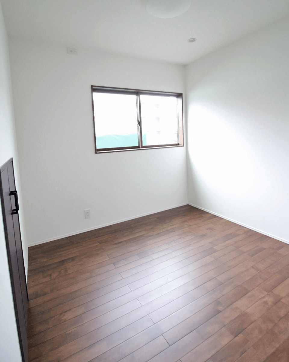 大きな窓から差し込む光が白い壁に反射して、明るく開放的な印象を与えるリビングは、ダークブラウンのフローリングを組み合わせることで、温かくも落ち着いた雰囲気に。