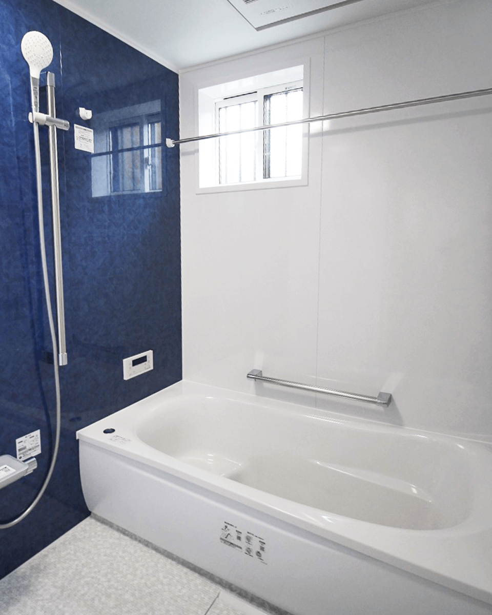 青い壁がアクセントのお風呂は、広々として、室内干しも可能です。